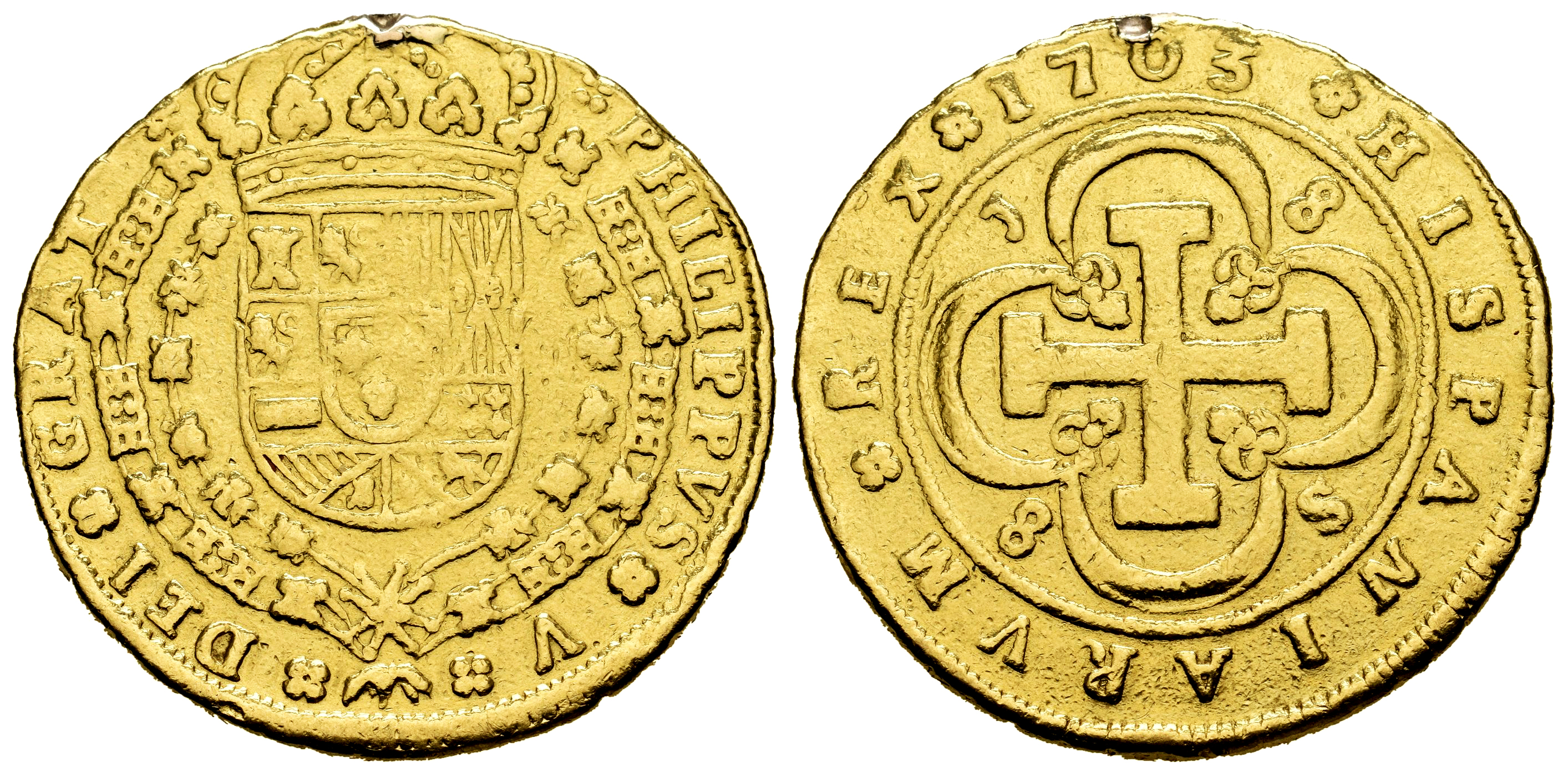 Felipe V (1700-1746). 8 escudos. 1703. Sevilla. J-8-8-S. (Cal-2270). (Cal onza-472). Au. 26,58 g. Tipo "Cruz". Restos de soldadura a las 12 h. Fue utilizada como joya. Rara. MBC. Est...3500,00.