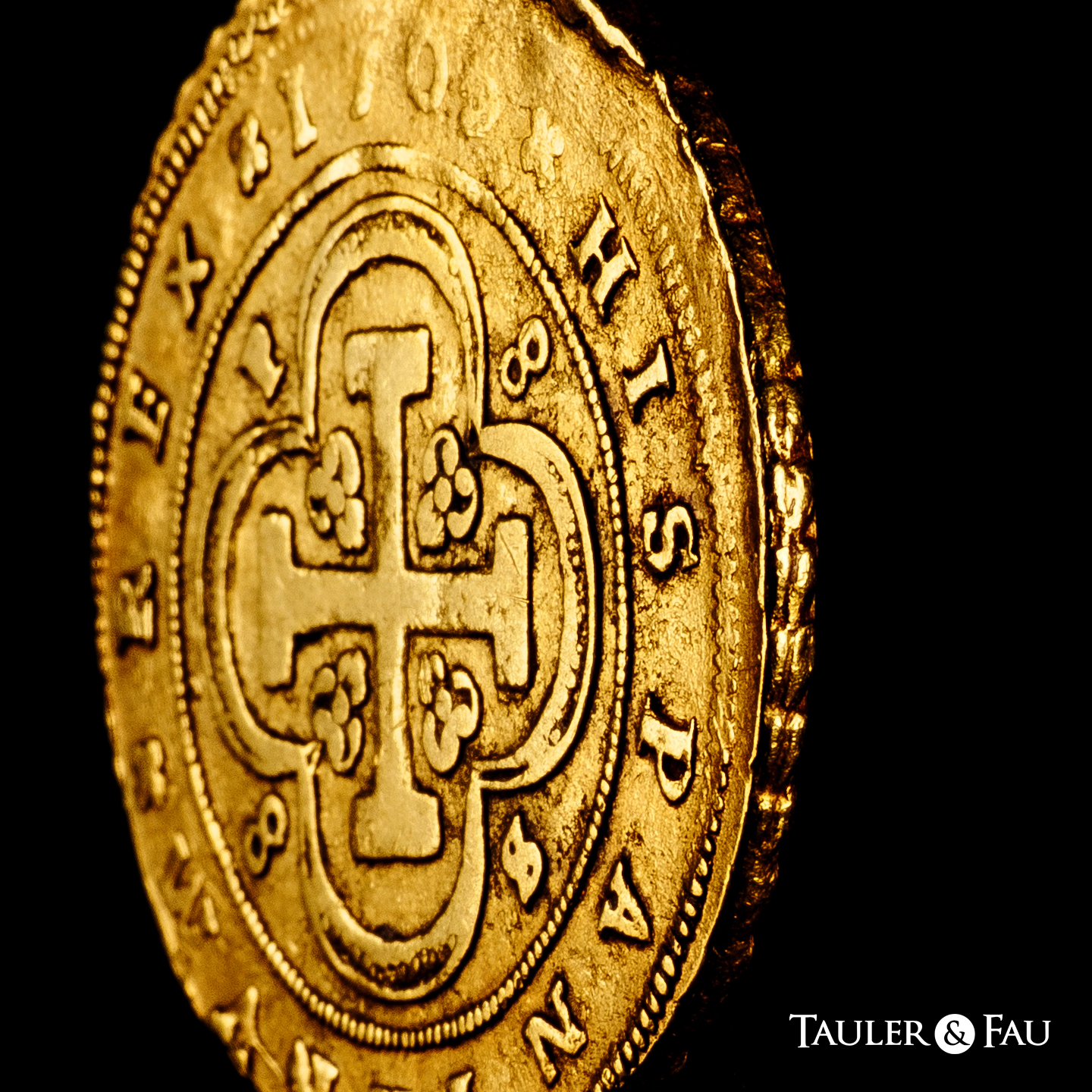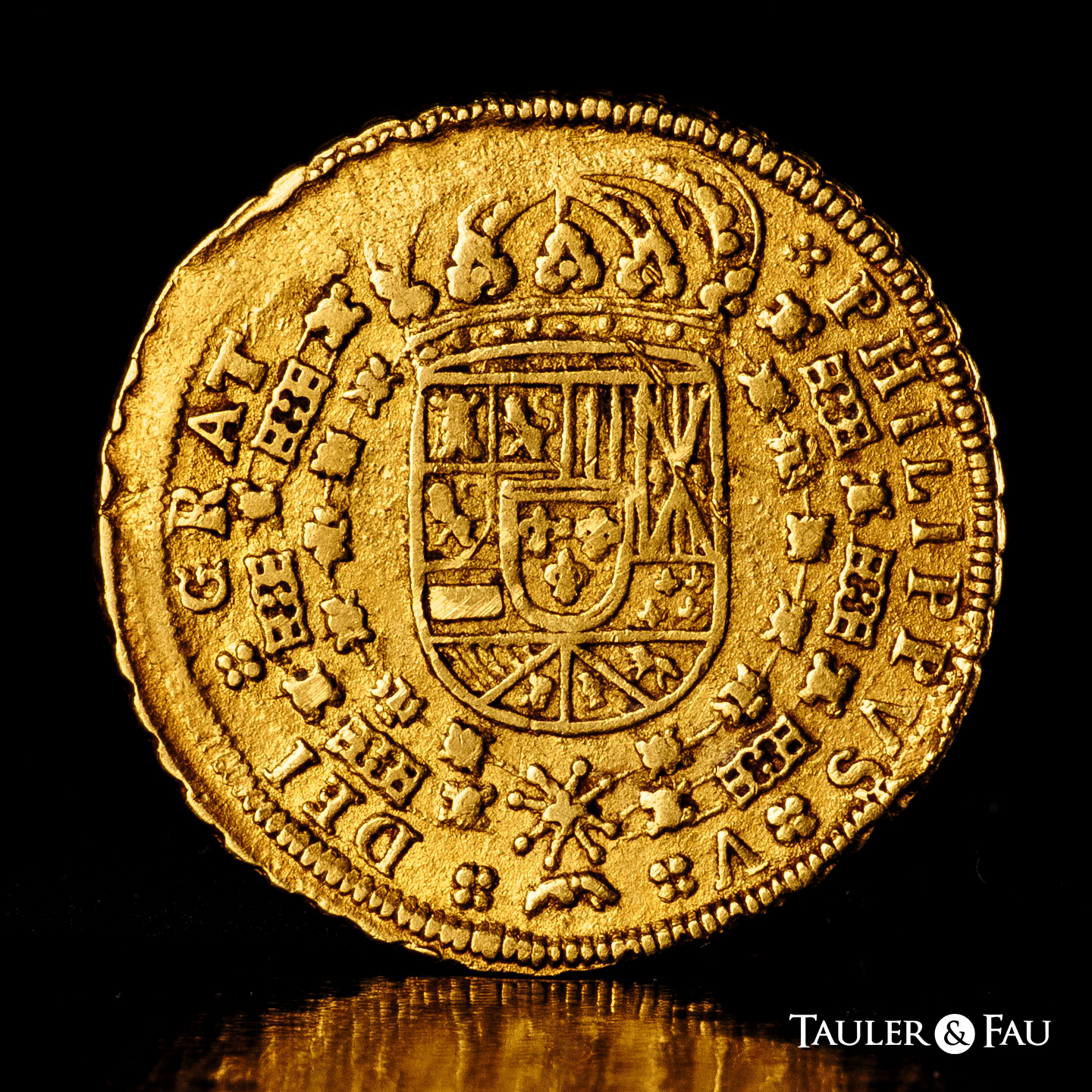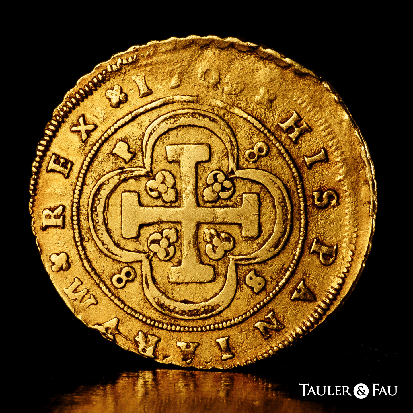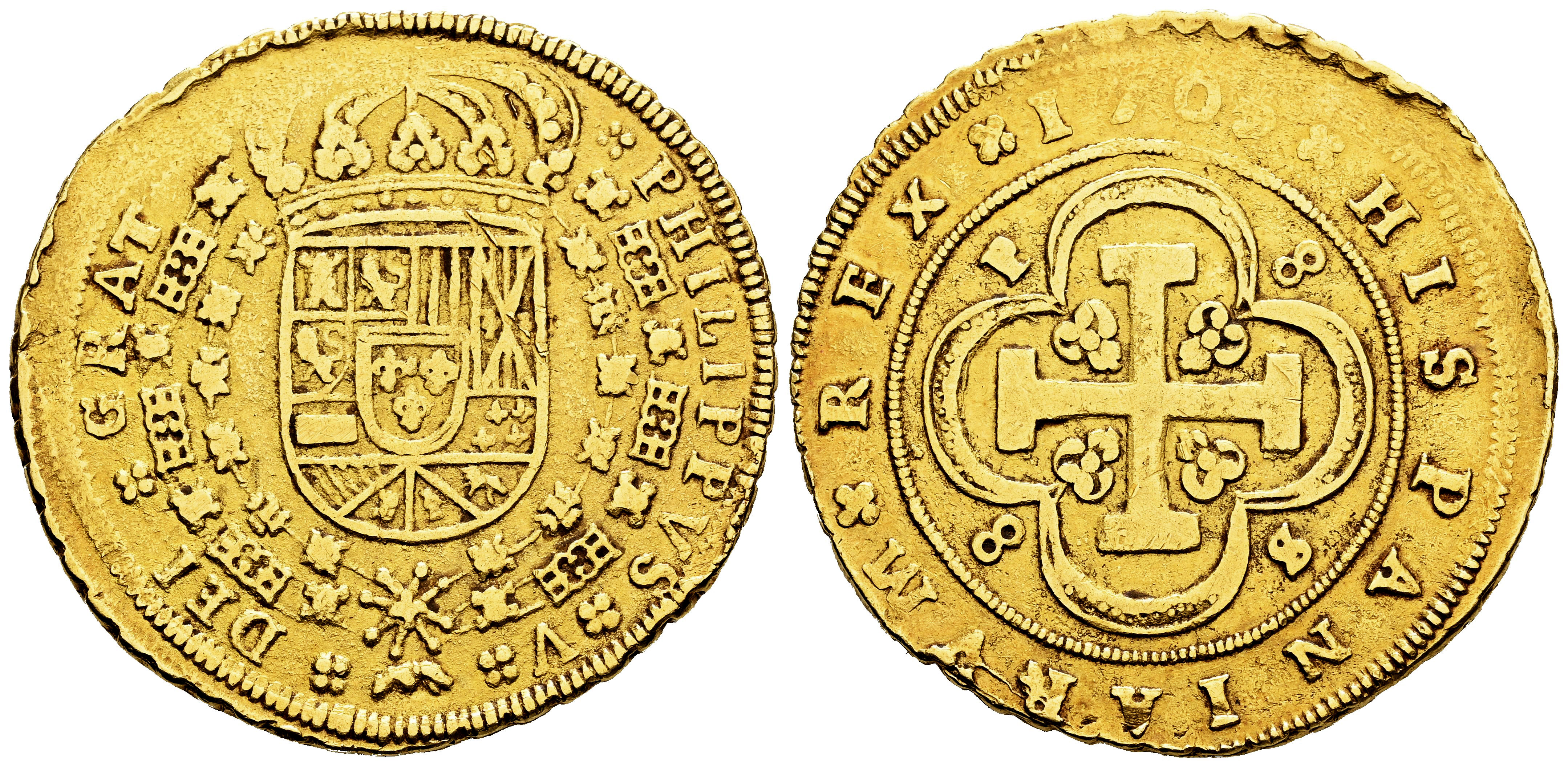 Felipe V (1700-1746). 8 escudos. 1705. Sevilla. P-8/8-S. (Cal-2273). (Cal onza-485). Au. 26,81 g. Tipo "Cruz". Acuñación algo floja con un ligero vano de acuñación en la fecha. Rara. Ex Cayón (14/12/2005), lote 4519. MBC+/MBC. Est...6000,00.