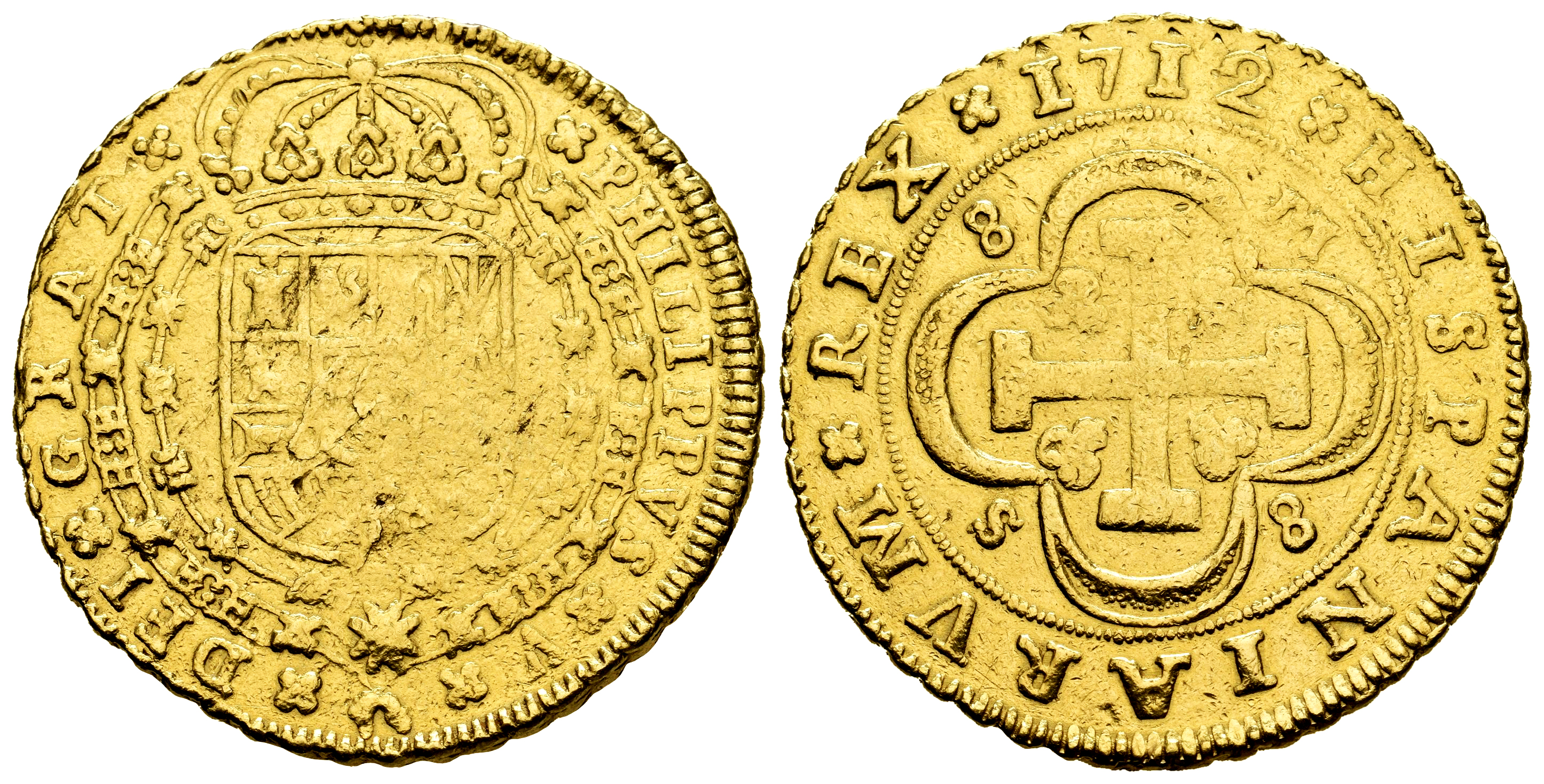 Felipe V (1700-1746). 8 escudos. 1712. Sevilla. 8-M/S-8. (Cal-2281). (Cal onza-495). Au. 27,07 g. Tipo "Cruz". Ceca, valor y ensayador en reverso. Soldadura expertamente reparada en el canto a las 12h. Sirvió como joya. Rara. MBC+. Est...4000,00.
