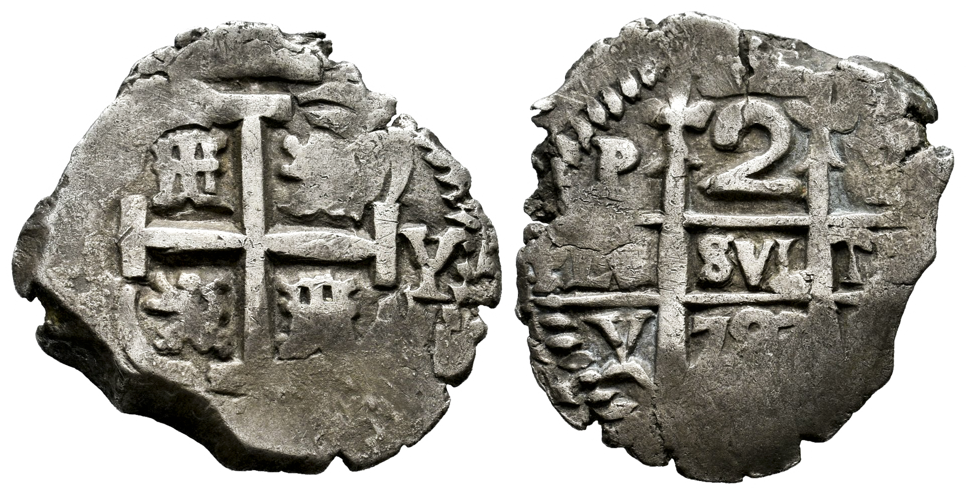 Luis I (1724). 2 reales. 1727. Potosí. Y. (Cal-27). (Bustos-P2R-27). Ag. 5,18 g. Doble ensayador. Rara. MBC+. Est...400,00.