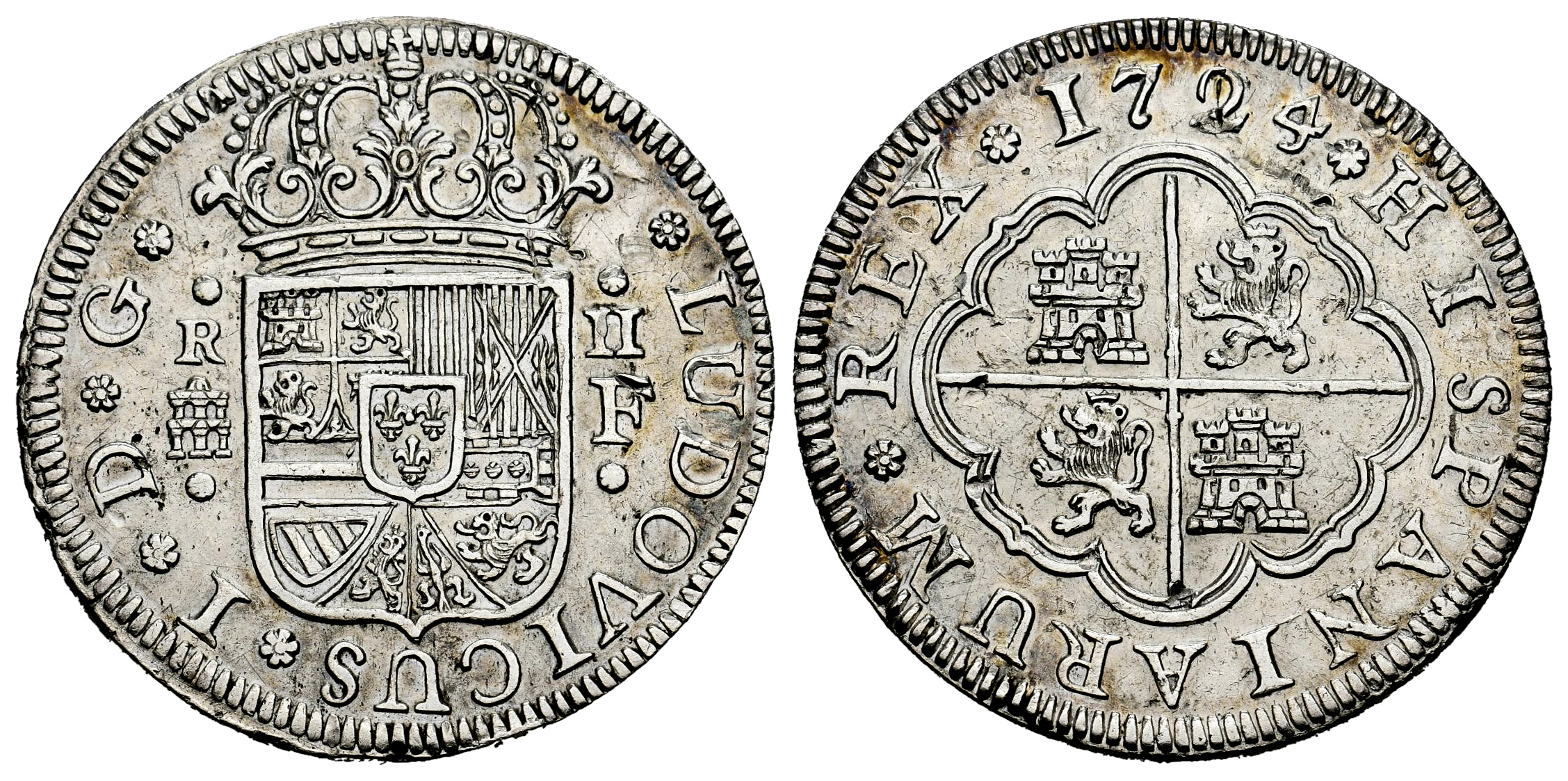 Luis I (1724). 2 reales. 1724. Segovia. F. (Cal-28). (Bustos-Sg2R-24c). Ag. 5,87 g. Variedad con rosteas tardías. Golpecitos. Muy escasa. EBC-. Est...600,00.