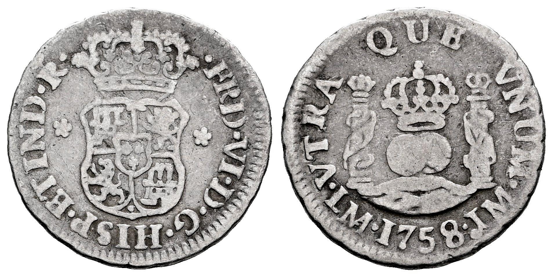 Fernando VI (1746-1759). 1/2 real. 1758. Lima. JM. (Cal-61). Ag. 1,56 g. BC+/MBC-. Est...45,00.