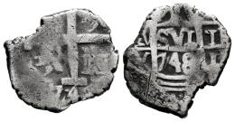 Fernando VI (1746-1759). 1 real. 1748. Lima. V. (Cal-145). Ag. 2,89 g. Doble fecha, una de ellas parcial. BC+/MBC-. Est...65,00.