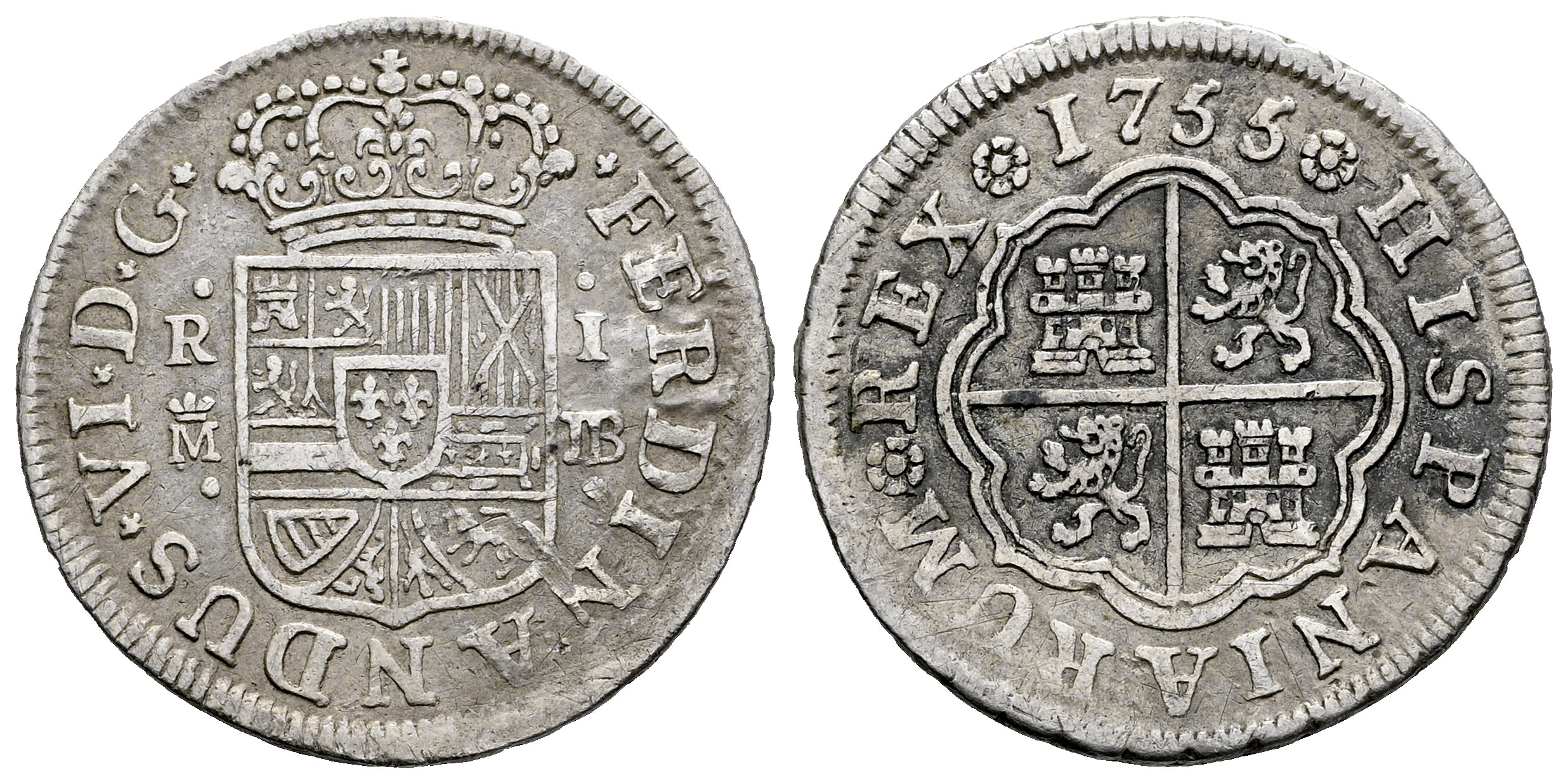 Fernando VI (1746-1759). 1 real. 1755. Madrid. JB. (Cal-179). Ag. 267,00 g. Defecto de acuñación. MBC. Est...30,00.