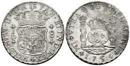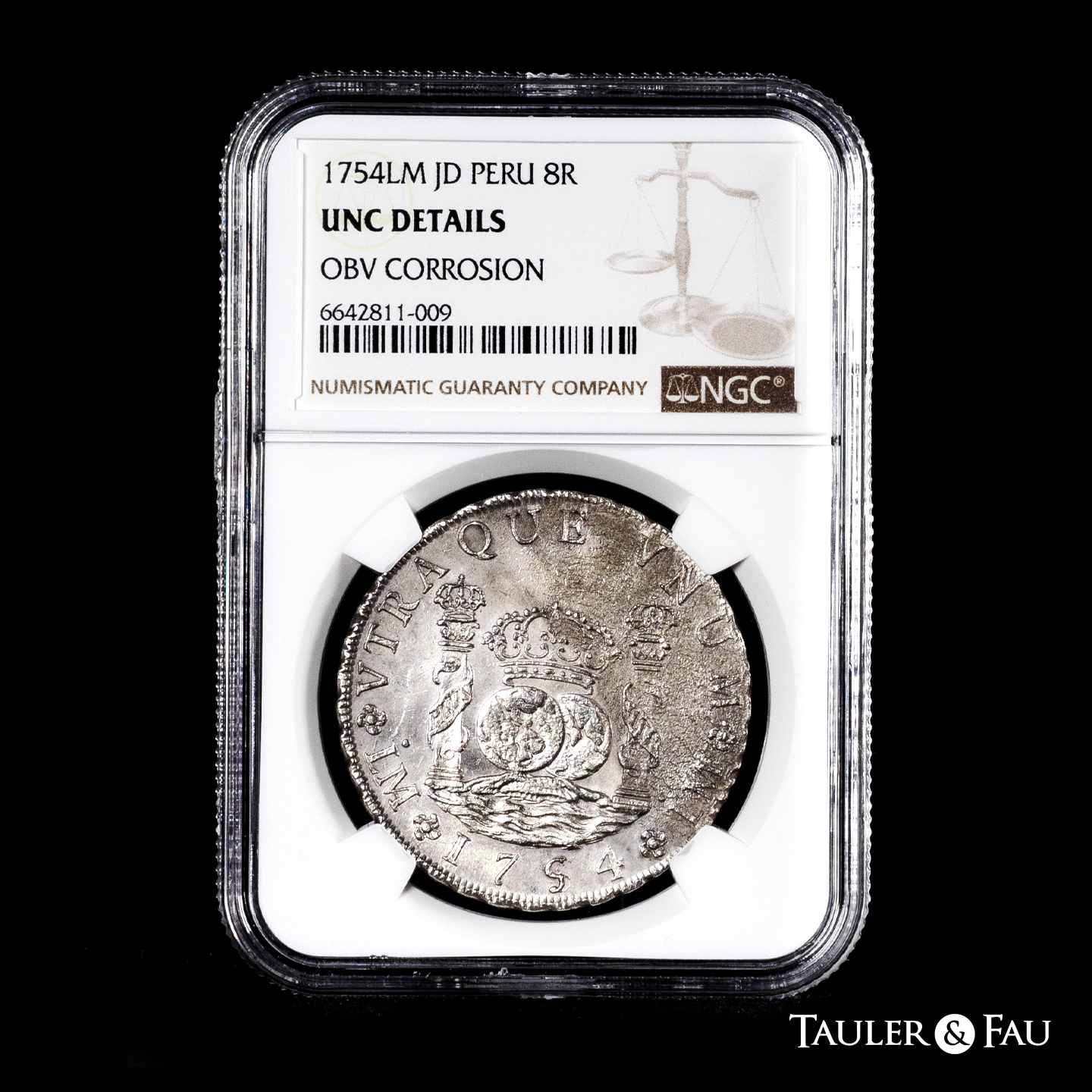 Fernando VI (1746-1759). 8 reales. 1757. Lima. JD. (Cal-457). Ag. Corrosión en reverso, por lo demás un impecable ejemplar. Brillo original. Encapsulada por NGC como UNC Details, Corrosion. Est...900,00.