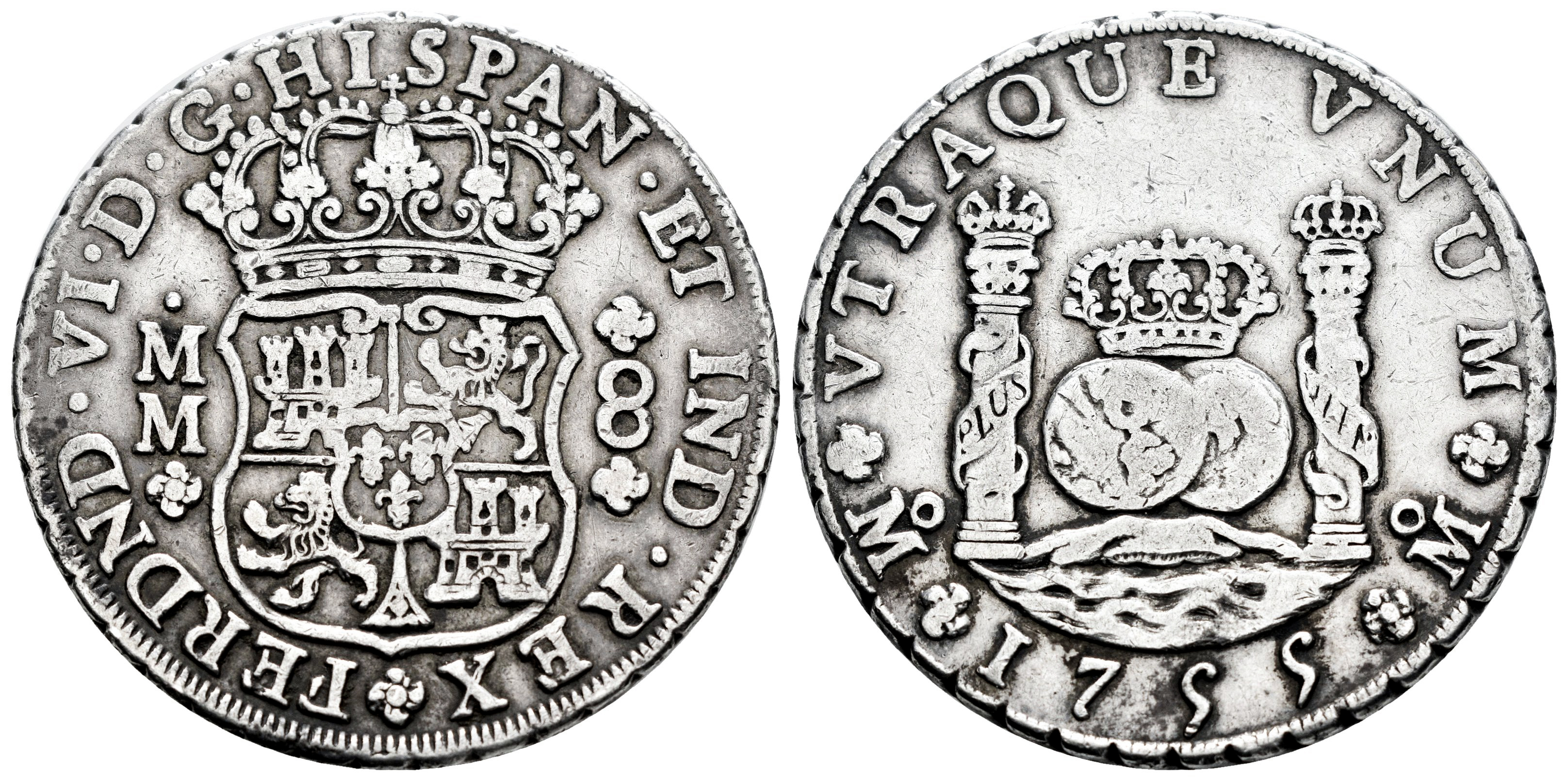 Fernando VI (1746-1759). 8 reales. 1755. México. MM. (Cal-489). Ag. 26,74 g. Limpiada. MBC/MBC-. Est...300,00.