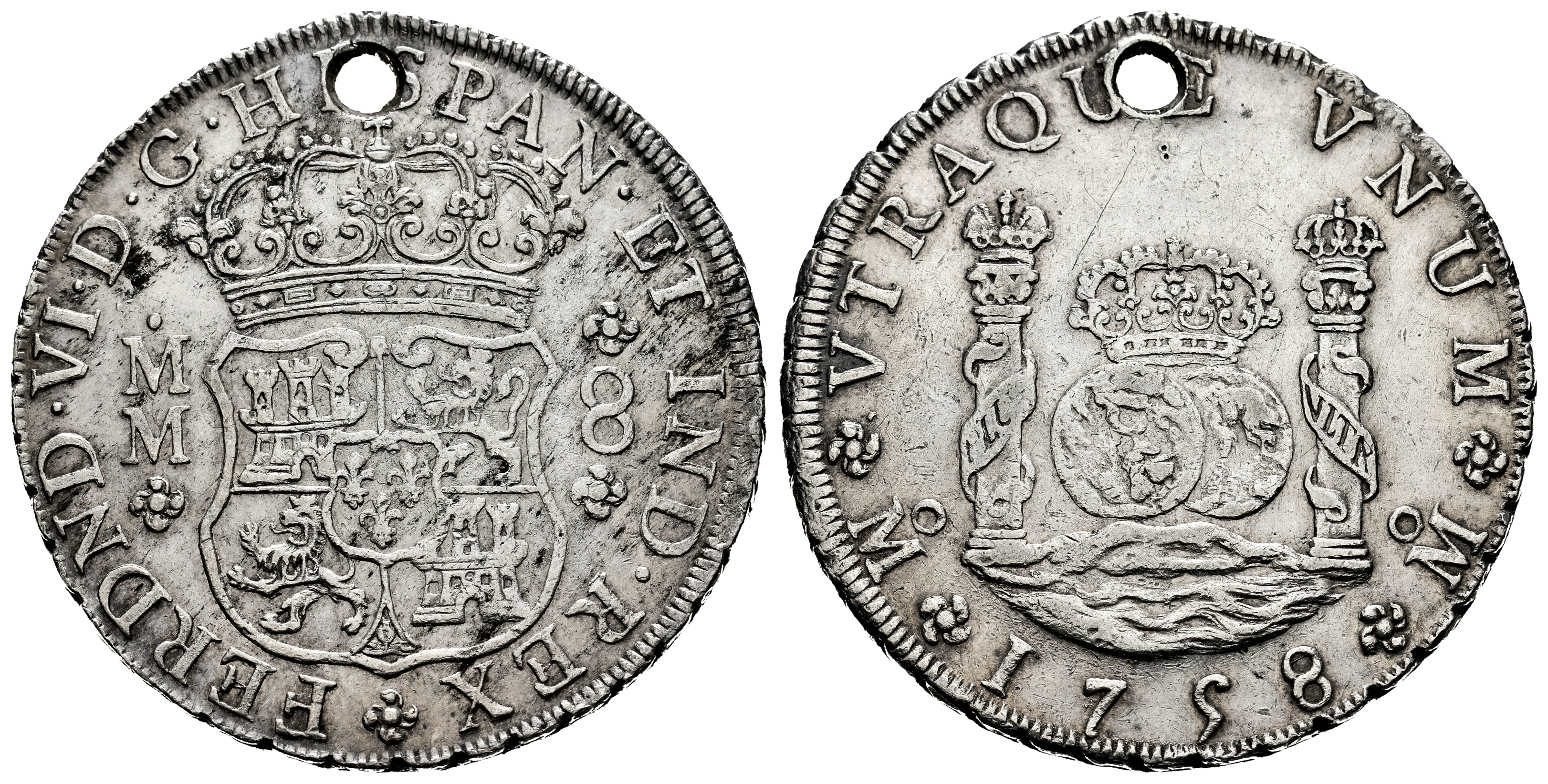 Fernando VI (1746-1759). 8 reales. 1858. México. MM. (Cal-494). Ag. 26,90 g. Perforación. MBC+. Est...200,00.
