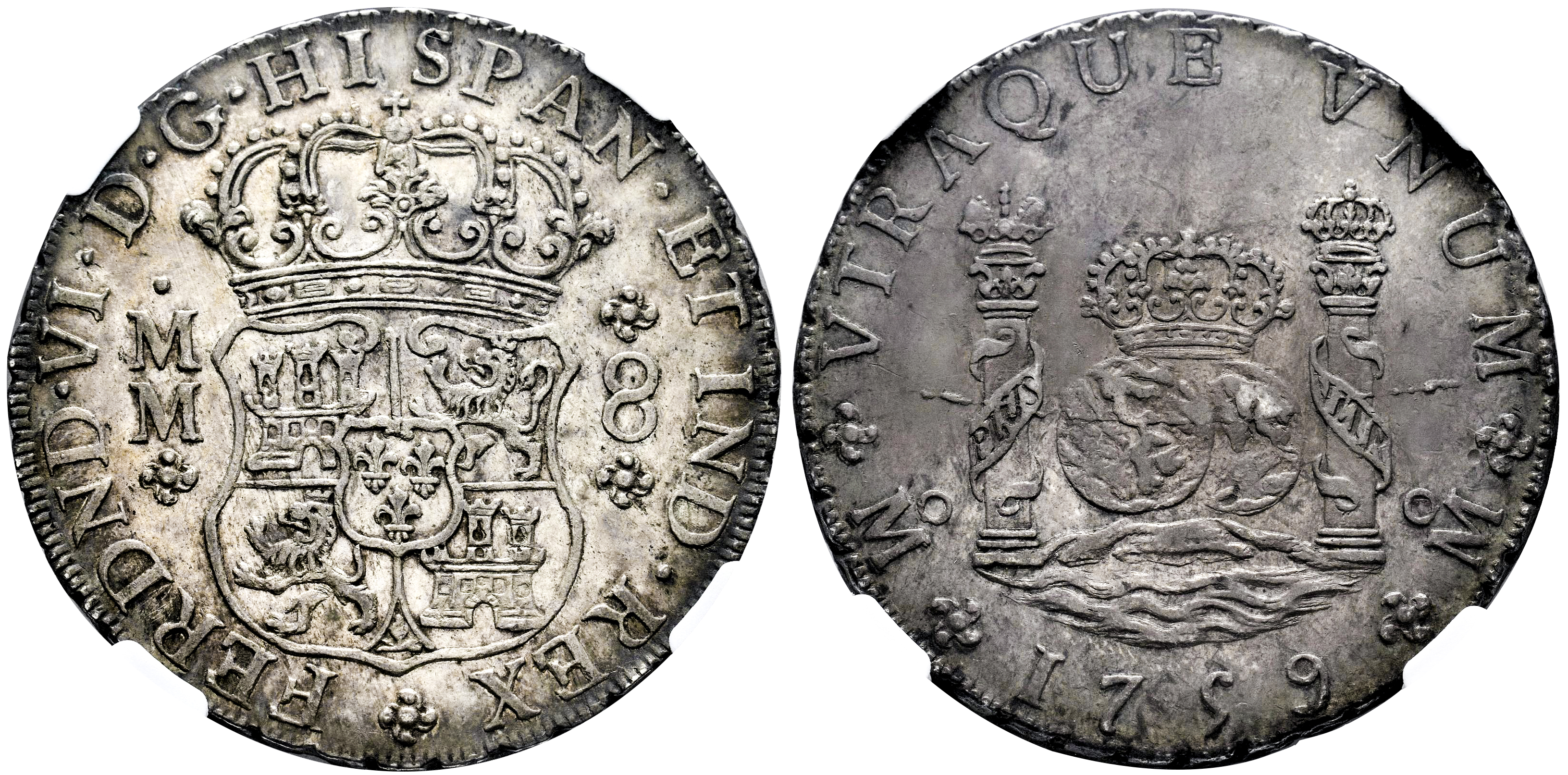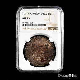 Fernando VI (1746-1759). 8 reales. 1759. México. MM. (Cal-495). Ag. Ligera pátina y suaves restos de brillo original. Encapsulada por NGC como AU 53. Est...600,00.