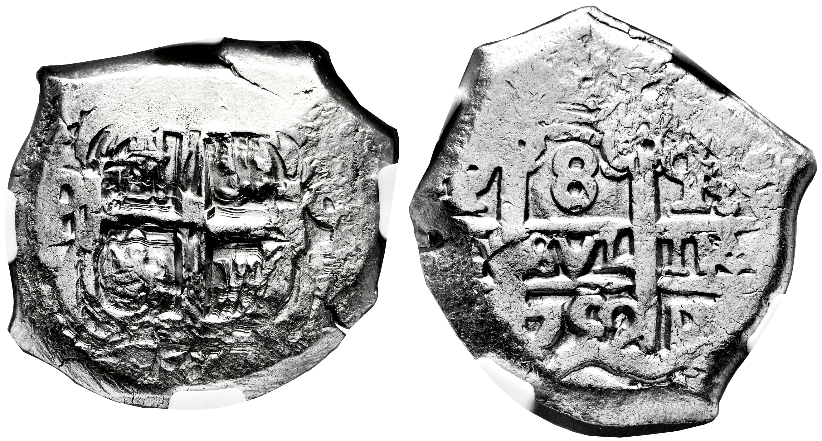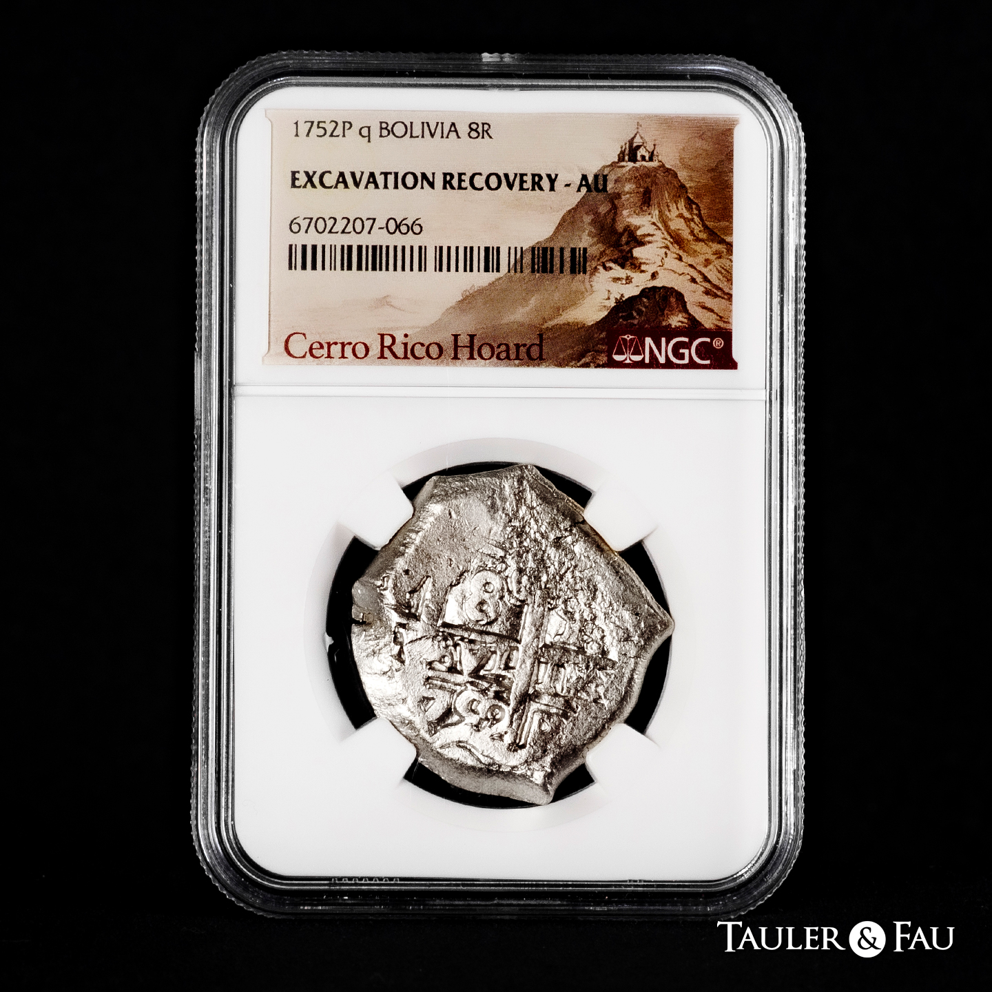 Fernando VI (1746-1759). 8 reales. 1752. Potosí. q. (Cal-522). Ag. Doble ensayador. Encapsulada por NGC como Excavation Recovery AU. Etiqueta especial "Cerro Rico Hoard". Est...400,00.