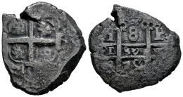 Fernando VI (1746-1759). 8 reales. 1752. Potosí. q. (Cal-523). Ag. 26,04 g. Marca de ceca y ensayadores intercambiados. Doble fecha, una de ellas parcial. Oxidaciones superficiales. Rara. MBC-. Est...250,00.