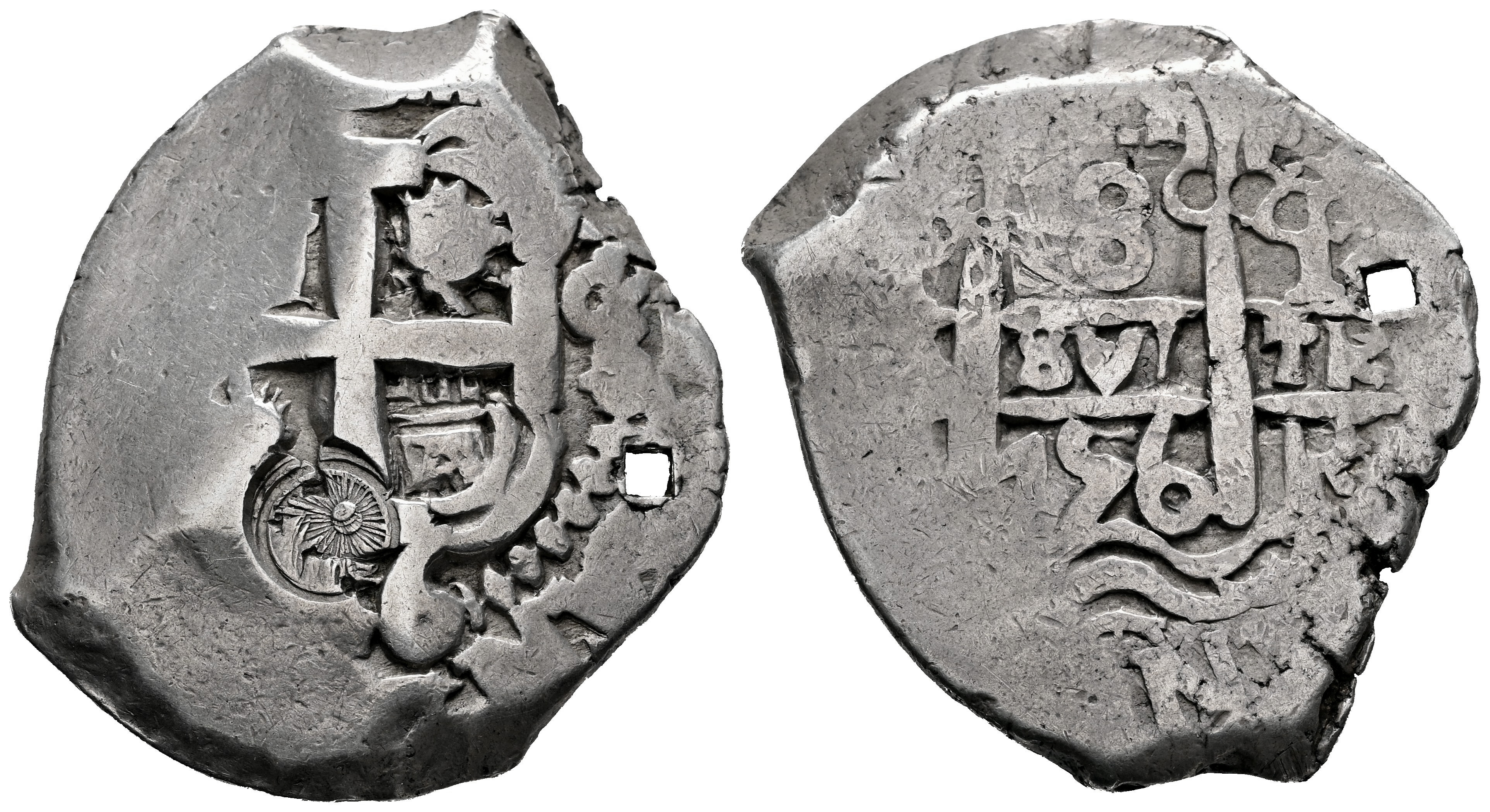 Fernando VI (1746-1759). 8 reales. ND (1839). (Cal-534 var). (Km-45). Ag. 26,19 g. Resello de Guatemala tipo II, sobre una moneda de 8 reales de 1756-q acuñada en Potosí bajo el reinado de Fernando VI. Doble fecha, una de ellas parcial. Perforación. Rara. MBC. Est...800,00.