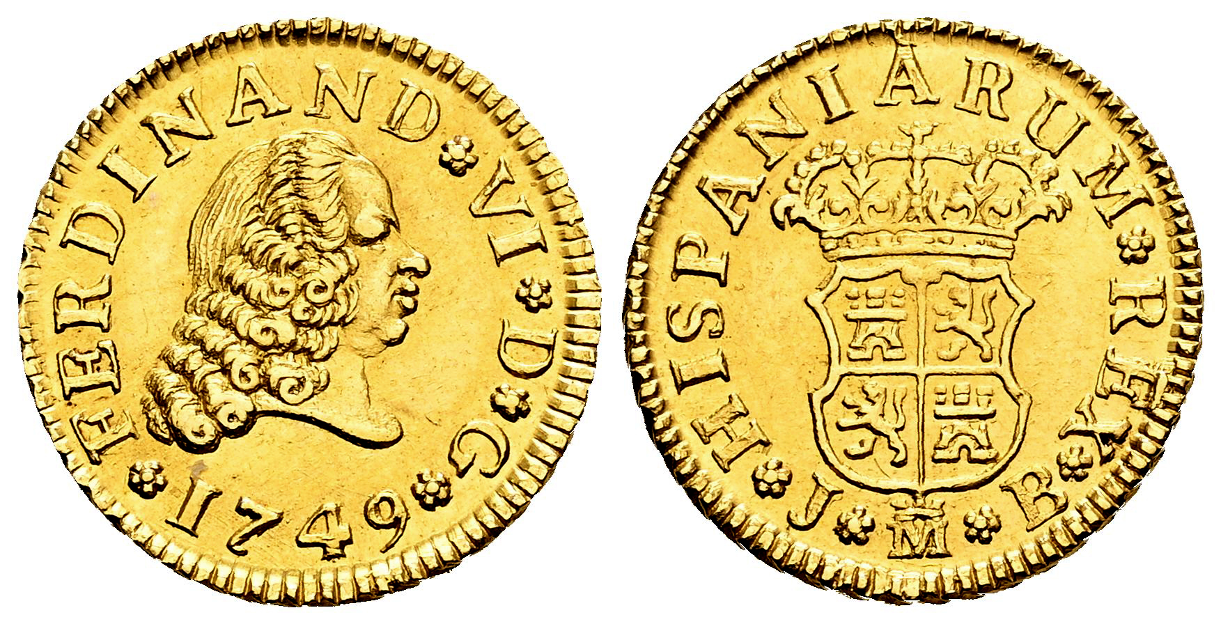Fernando VI (1746-1759). 1/2 escudo. 1749. Madrid. JB. (Cal-551). Au. 1,78 g. Restos de brillo original. EBC. Est...250,00.
