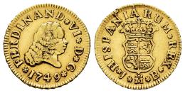 Fernando VI (1746-1759). 1/2 escudo. 1749. Madrid. JB. (Cal-551). Au. 1,75 g. Segundo busto. Golpecito en el canto. MBC. Est...220,00.