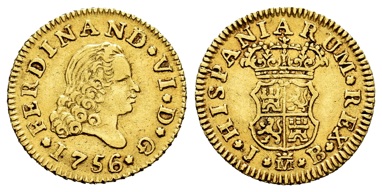 Fernando VI (1746-1759). 1/2 escudo. 1756. Madrid. JB. (Cal-559). Au. 1,77 g. Tercer busto. MBC+. Est...250,00.