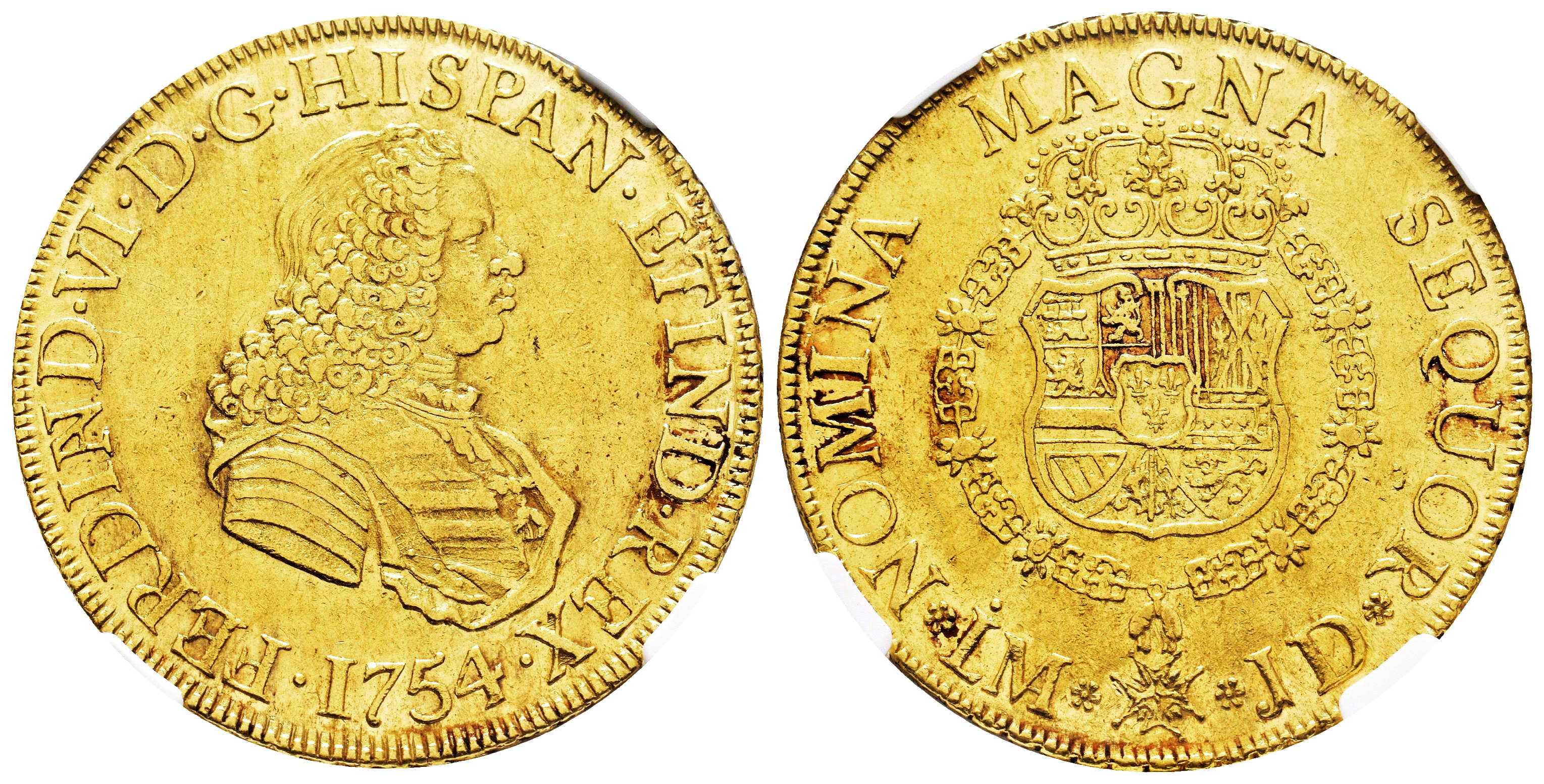 Fernando VI (1746-1759). 8 escudos. 1754. Lima. JD. (Cal-767). (Cal onza-581). Au. Algunas rayas. Restos de brillo original. Escasa. Encapsulada por NGC como AU Details, Obv. scratched. Est...4000,00.