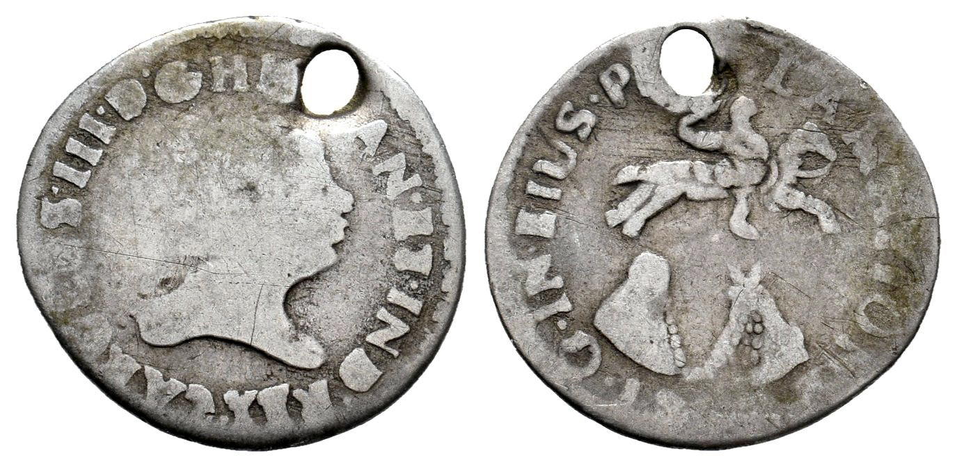 Carlos III (1759-1788). Medalla de proclamación. 1760. Guatemala. (Ha-64). (Ruiz Trapero-77). (Vq-13040). Ag. 1,43 g. Módulo de 1/2 real. Agujero. Rara. BC/BC+. Est...100,00.