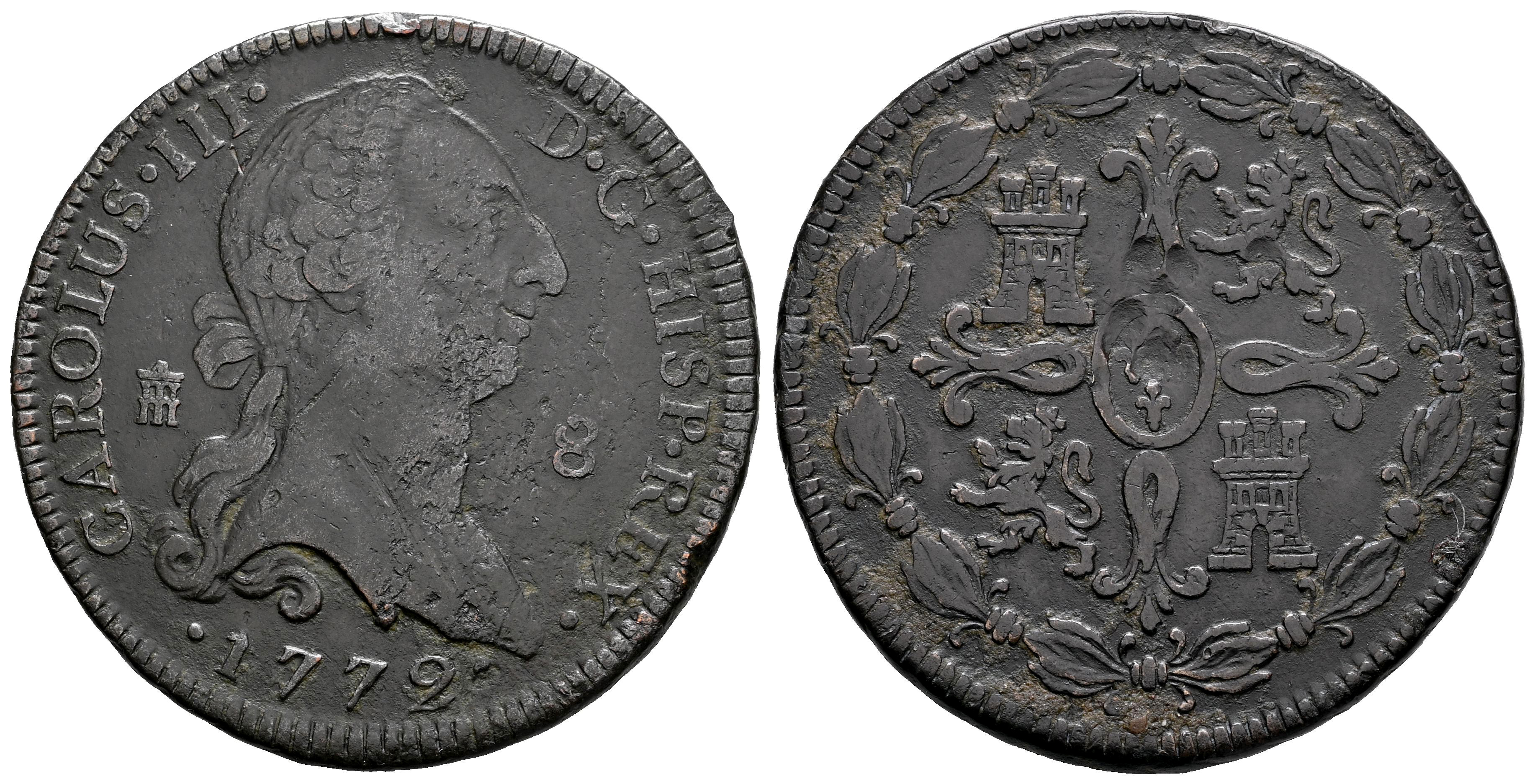 Carlos III (1759-1788). 8 maravedís. 1772. Segovia. (Cal-69). Ae. 11,58 g. Golpes y ligeras oxidaciones limpiadas. Escasa. MBC-. Est...75,00.