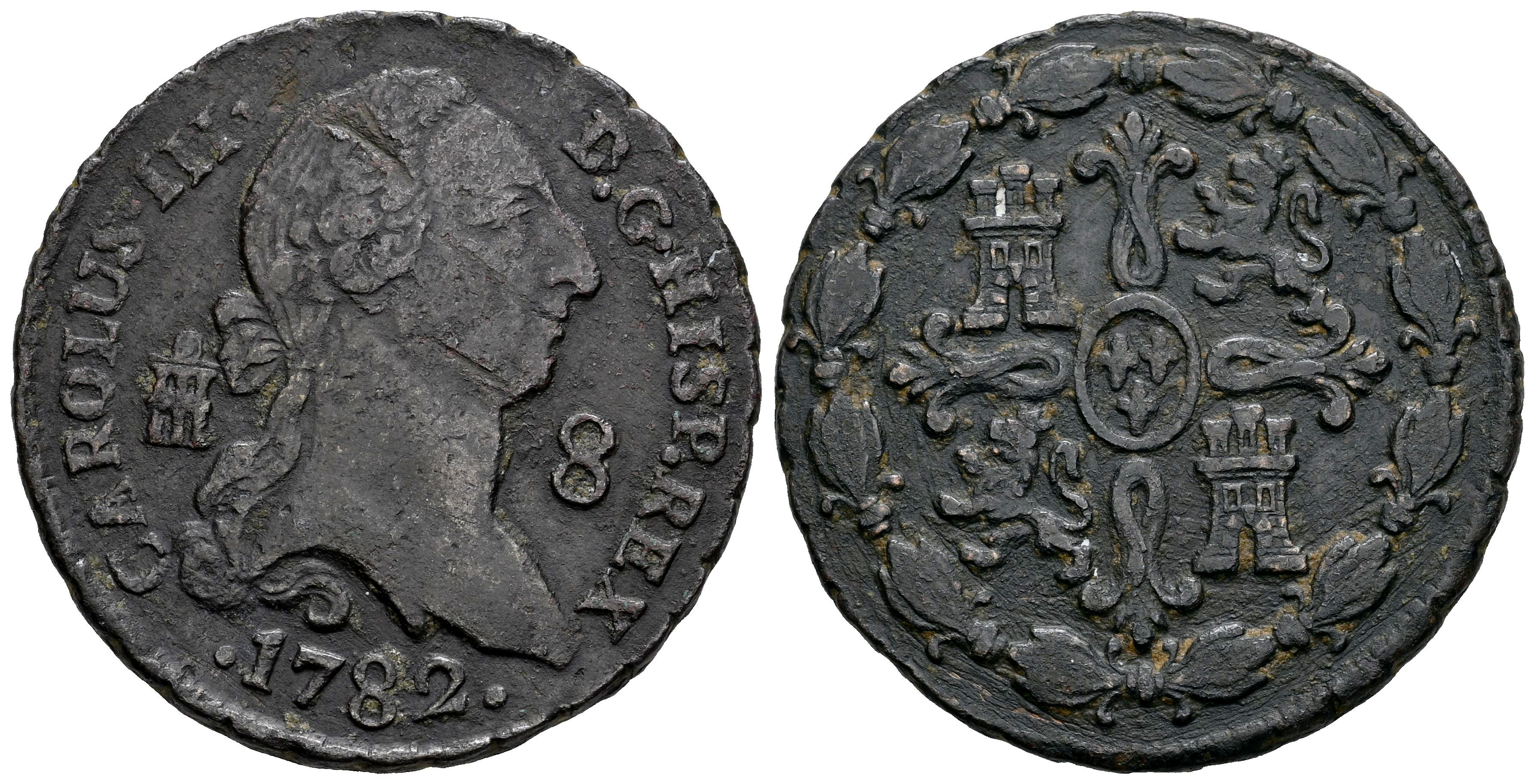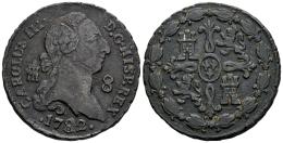 Carlos III (1759-1788). 8 maravedís. 1782. Segovia. (Cal-79). Ae. 11,97 g. Rayas y oxidaciones limpiadas. MBC-. Est...35,00.
