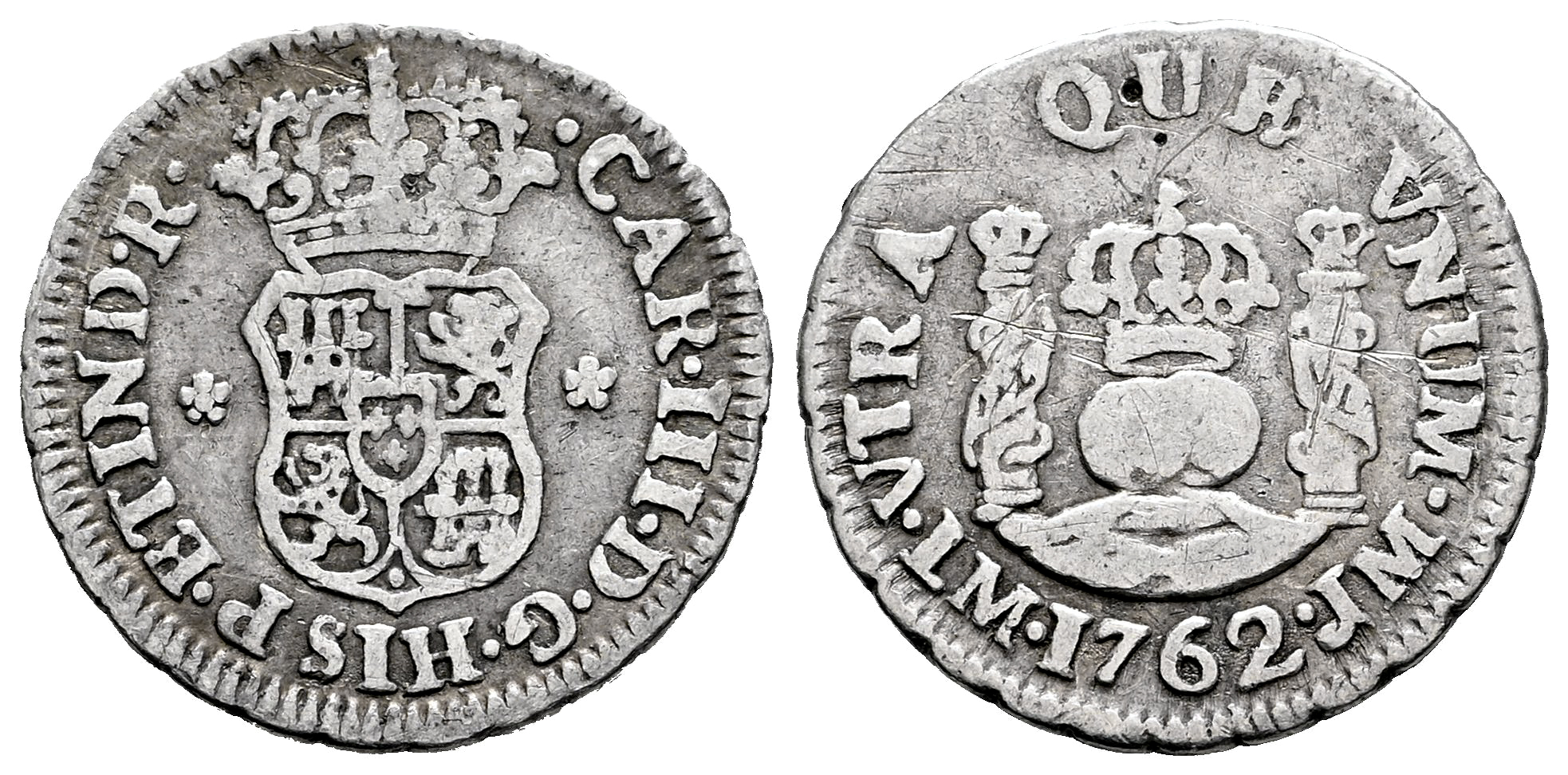 Carlos III (1759-1788). 1/2 real. 1762. Lima. JM. (Cal-113). Ag. 1,62 g. Rayas en reverso. MBC-. Est...45,00.