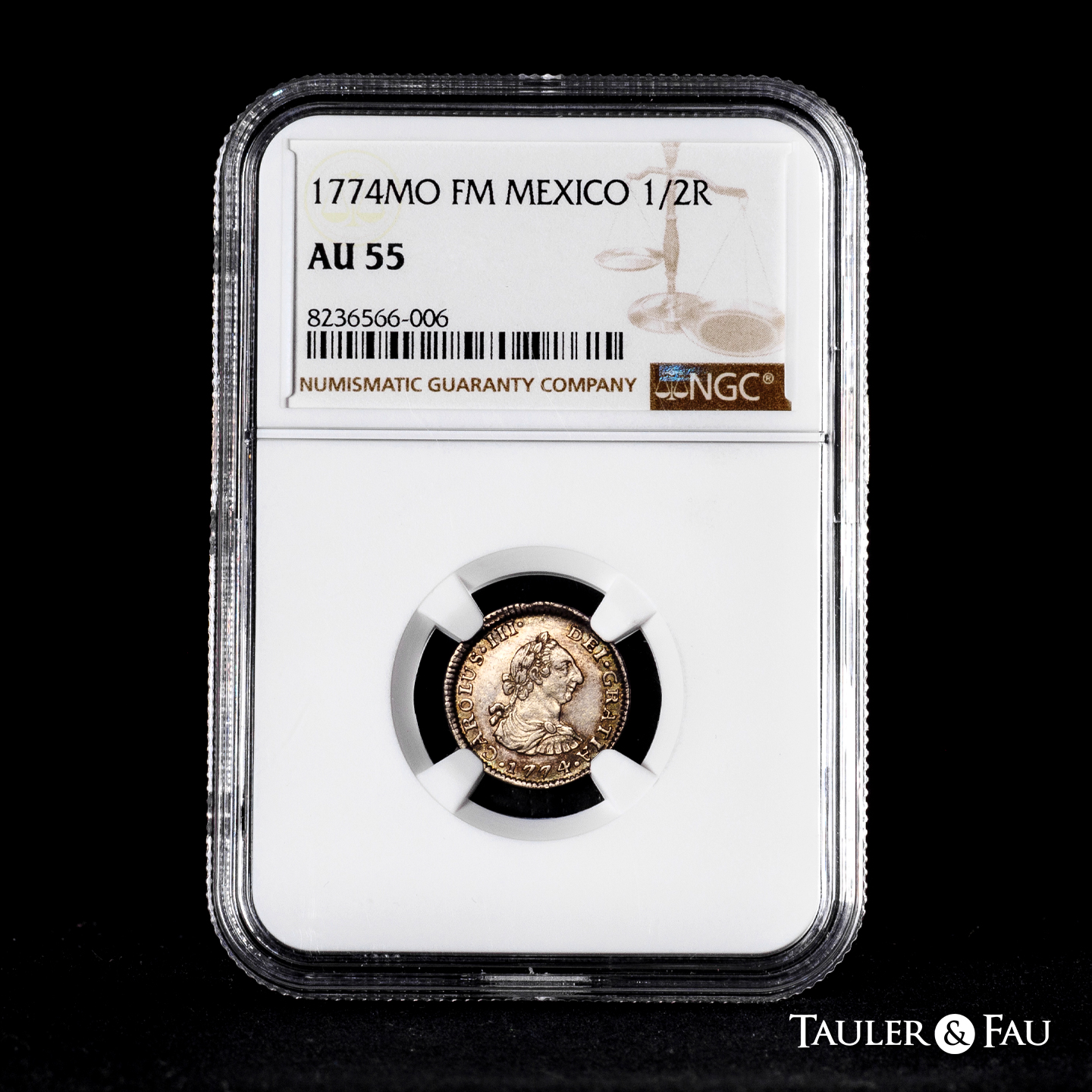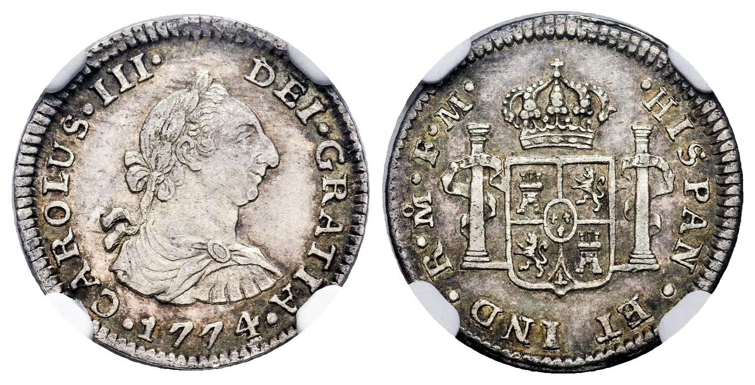 Carlos III (1759-1788). 1/2 real. 1774. México. FM. (Cal-197). Ag. Ligero tono. Restos de brillo original. Escasa así. Encapsulada por NGC como AU 55. Est...250,00.