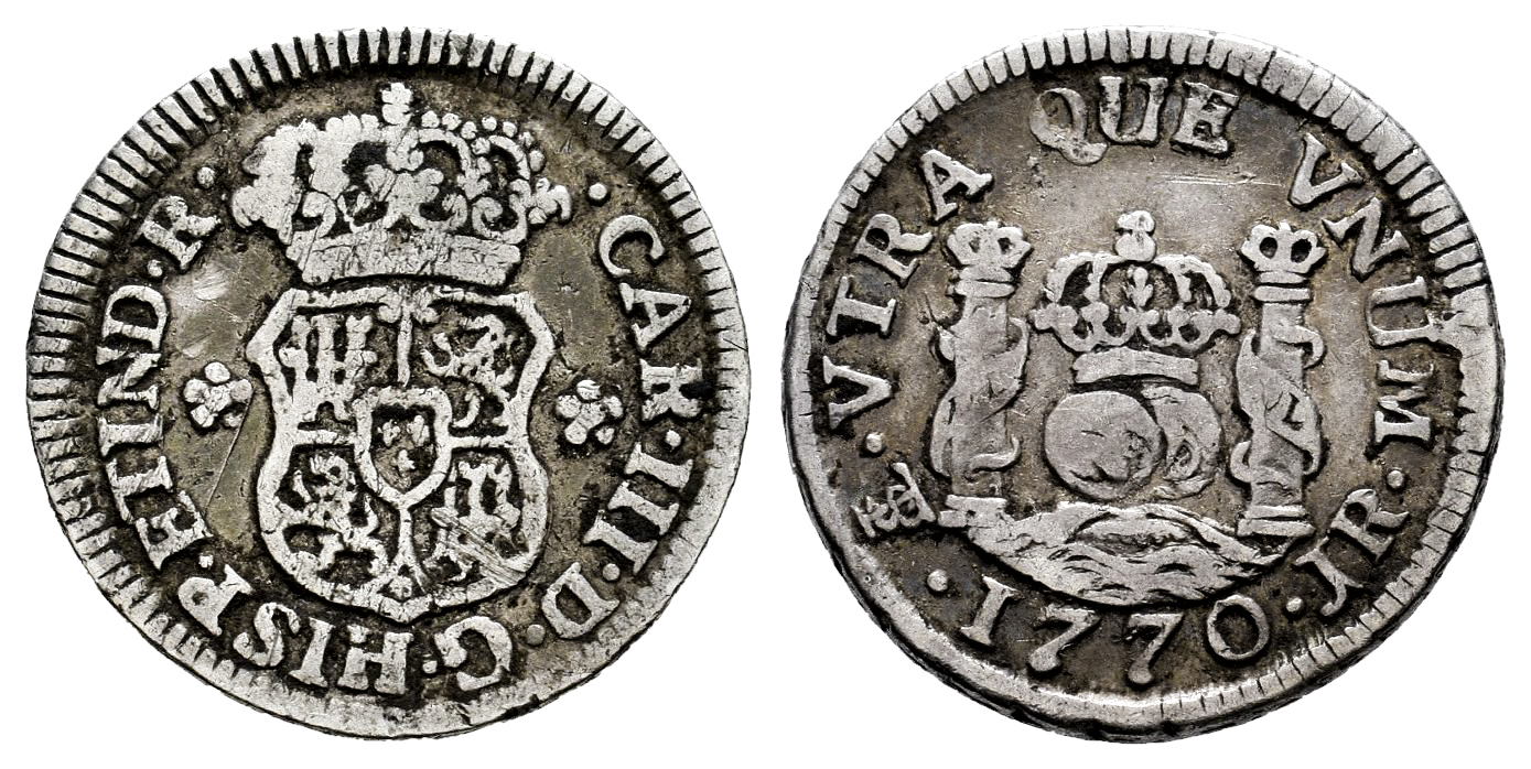 Carlos III (1759-1788). 1/2 real. 1770. Potosí. JR. (Cal-237). Ag. 1,57 g. Escasa. MBC-. Est...75,00.