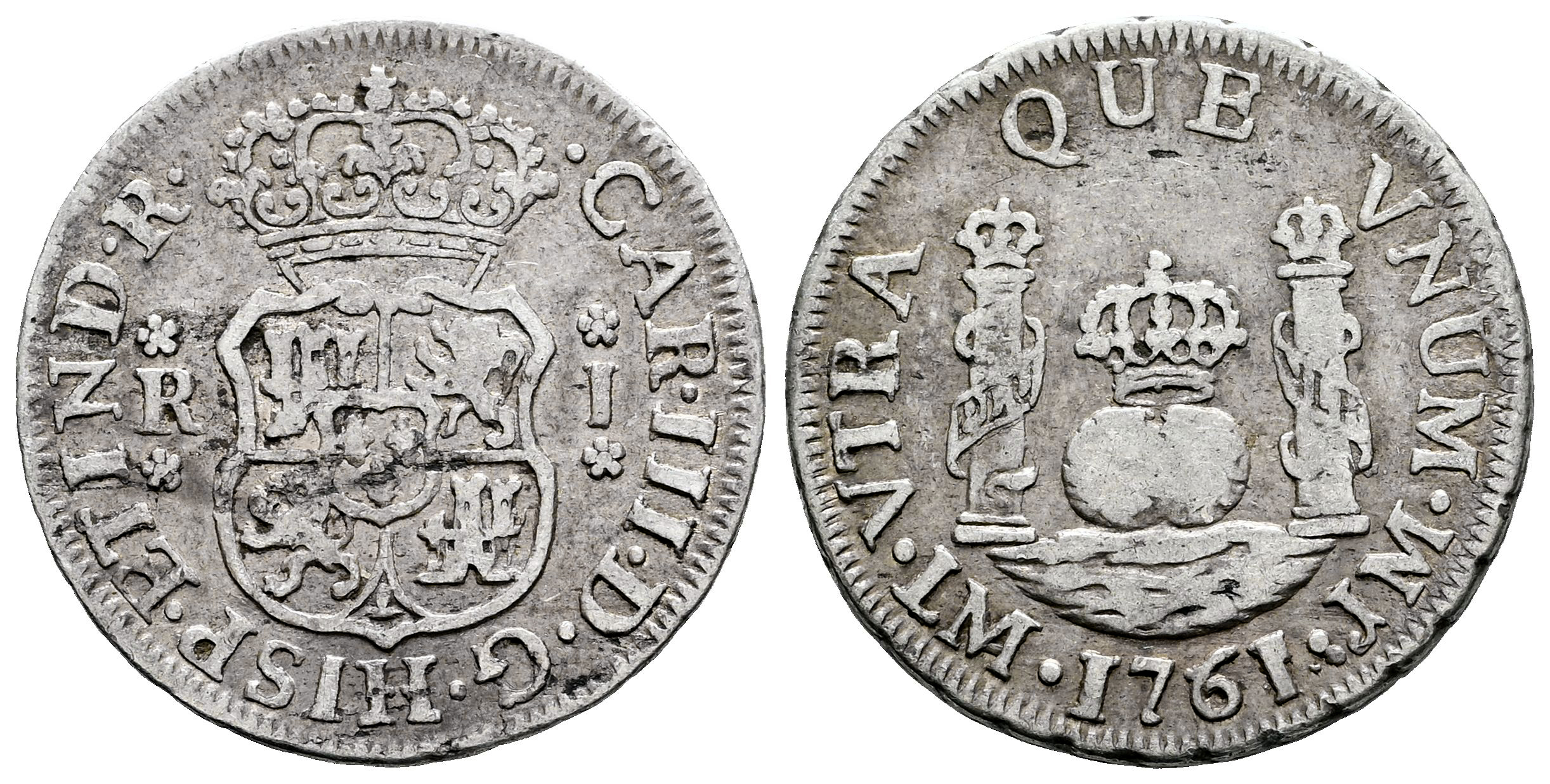 Carlos III (1759-1788). 1 real. 1761. Lima. JM. (Cal-344). Ag. 3,36 g. Escasa. MBC-. Est...60,00.