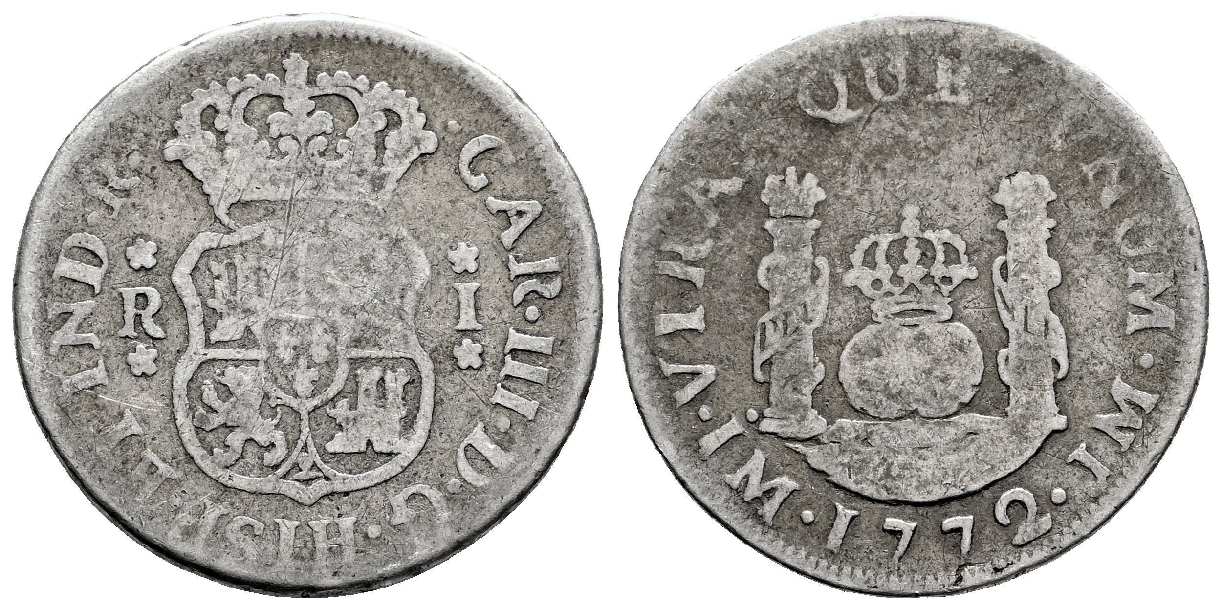 Carlos III (1759-1788). 1 real. 1772. Lima. JM. (Cal-355). Ag. 3,12 g. Punto sobre la primera LMA. BC. Est...45,00.