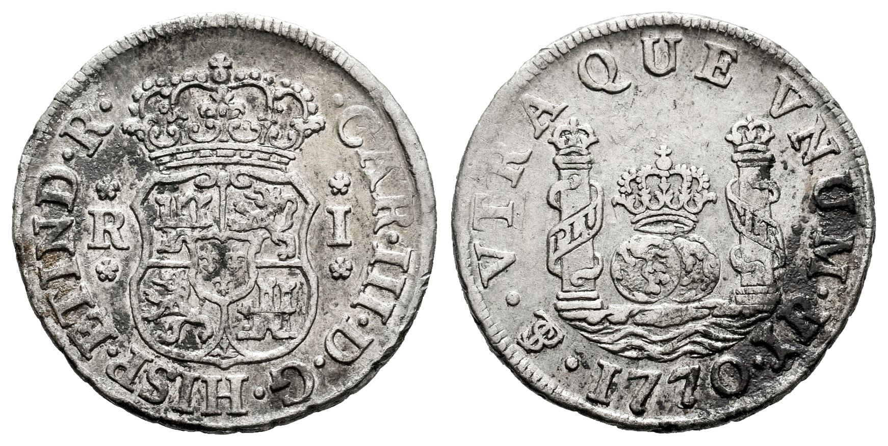 Carlos III (1759-1788). 1 real. 1770. Potosí. JR. (Cal-469). Ag. 3,40 g. Leves oxidaciones pero bonito ejemplar. MBC+. Est...120,00.