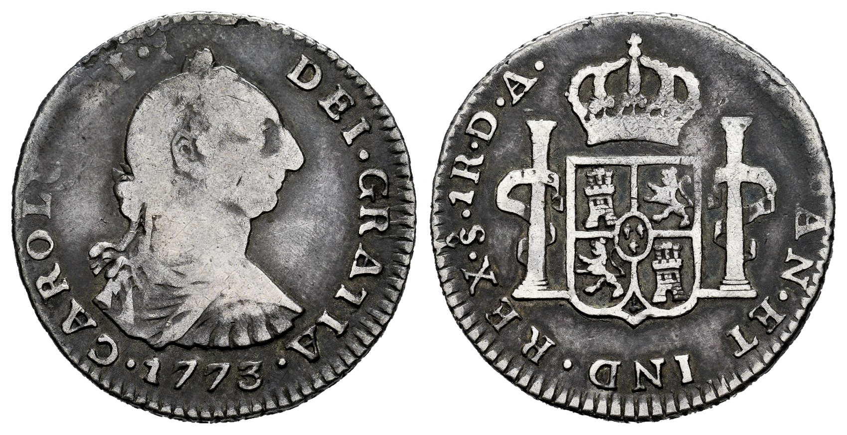 Carlos III (1759-1788). 1 real. 1773. Santiago. DA. (Cal-507). Ag. 3,28 g. Primer año de busto. Tono. Muy rara, pocos ejemplares conocidos. BC+. Est...200,00.