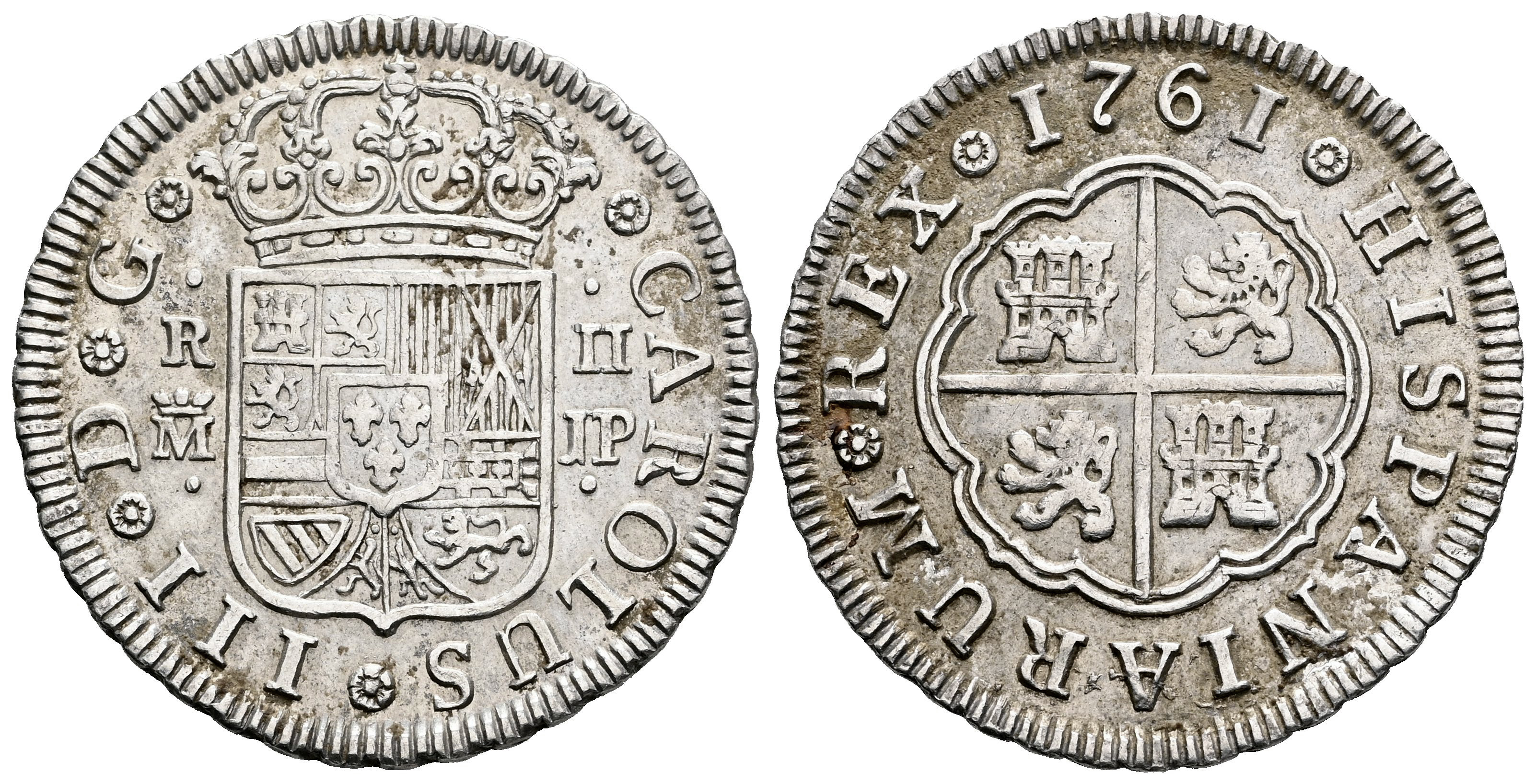 Carlos III (1759-1788). 2 reales. 1761. Madrid. JP. (Cal-609). Ag. 6,11 g. Restos de suciedad. EBC-/MBC+. Est...150,00.