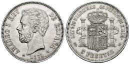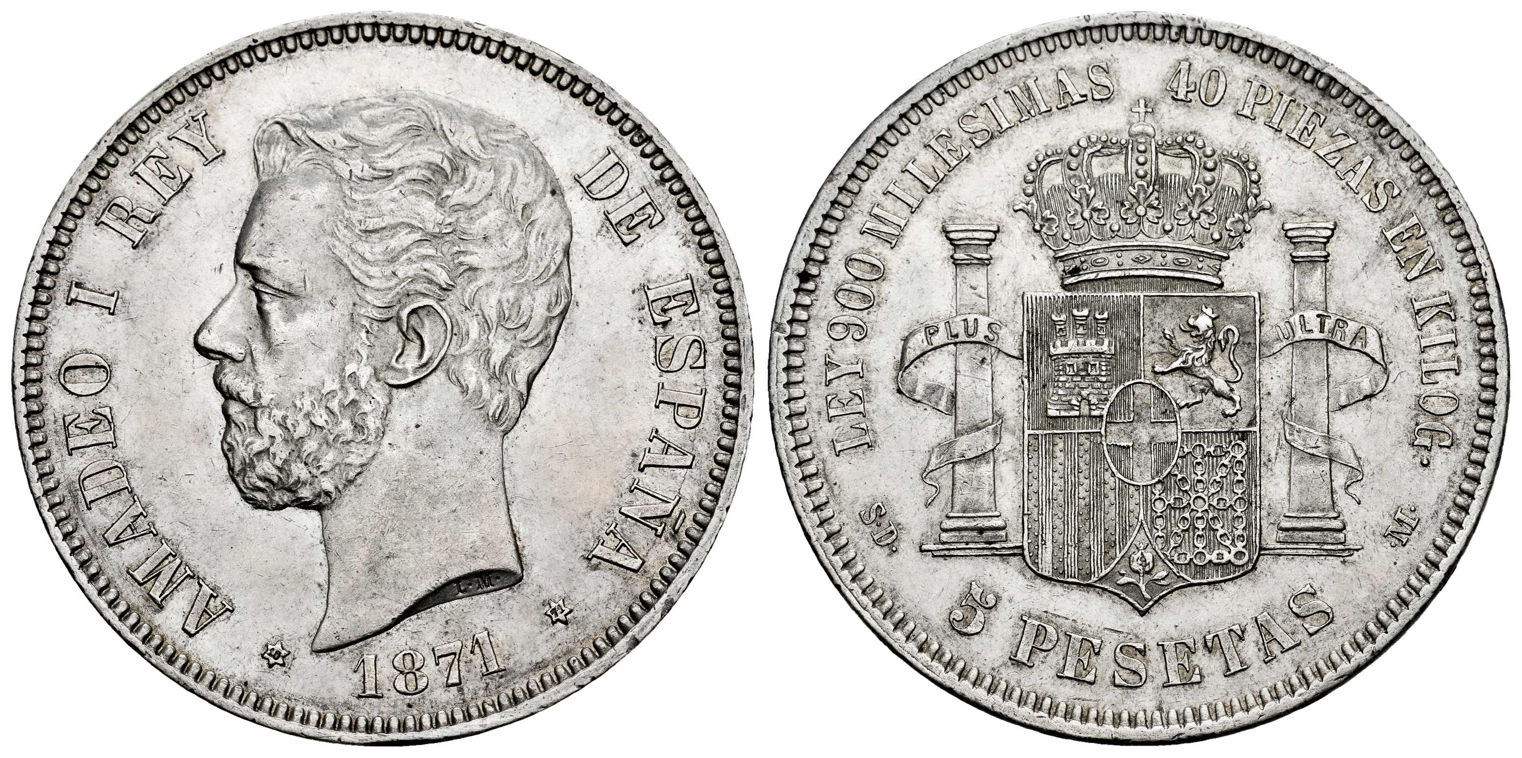 Centenario de la Peseta (1868-1931). Amadeo I (1871-1873). 5 pesetas. 1871*18-71. Madrid. SDM. (Cal-1). Ag. 24,98 g. Golpecitos en el canto. Buen ejempalr. EBC/EBC-. Est...300,00.