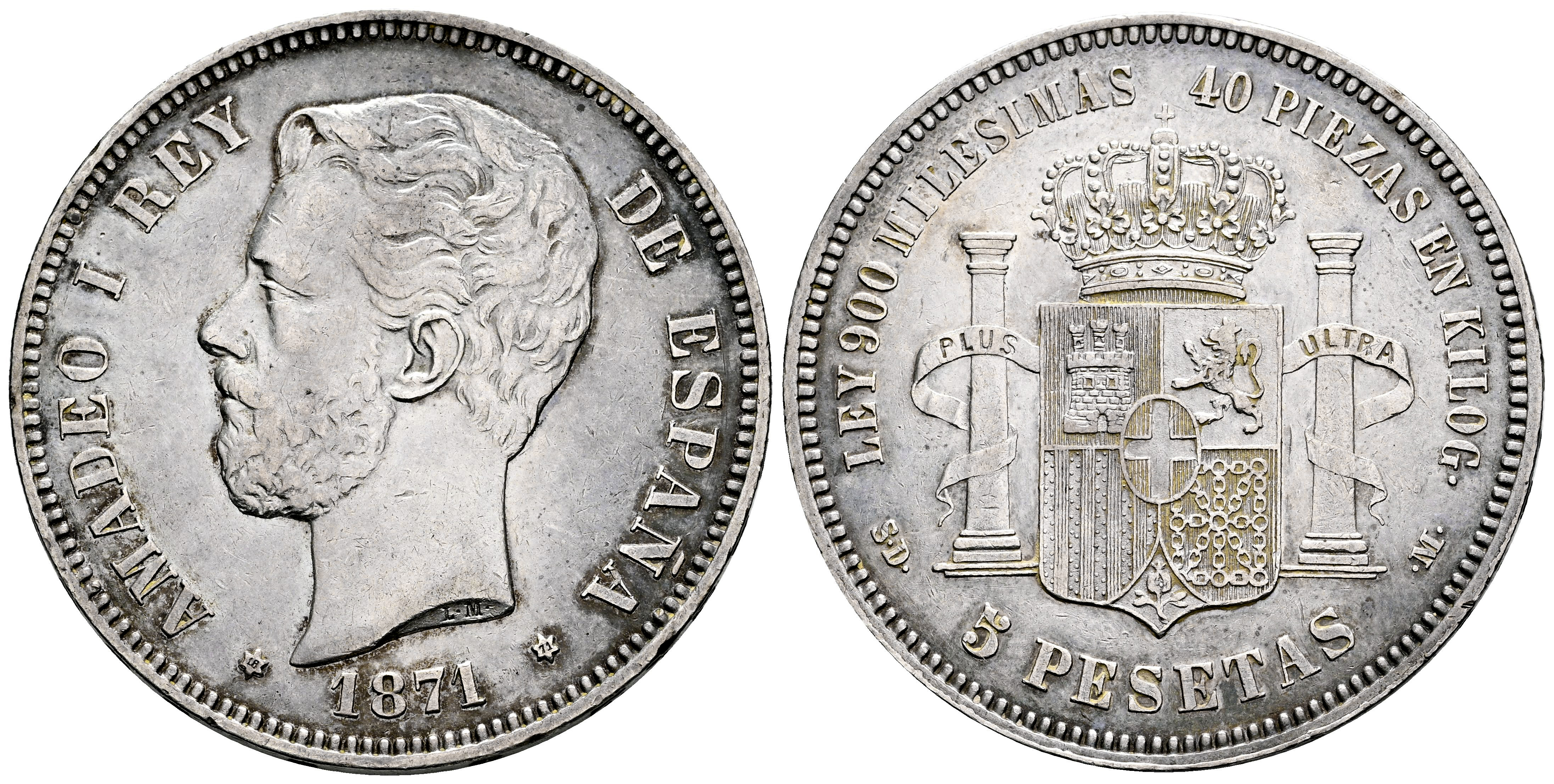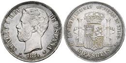 Centenario de la Peseta (1868-1931). Amadeo I (1871-1873). 5 pesetas. 1871*18-71. Madrid. SDM. (Cal-1). Ag. 24,95 g. Leves marquitas. Ligeramente limpiada. MBC+. Est...90,00.