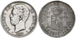 Centenario de la Peseta (1868-1931). Amadeo I (1871-1873). 5 pesetas. 1871*18-74. Madrid. DEM. (Cal-5). Ag. 24,90 g. Golpes en el canto. Limpiada. MBC+. Est...75,00.