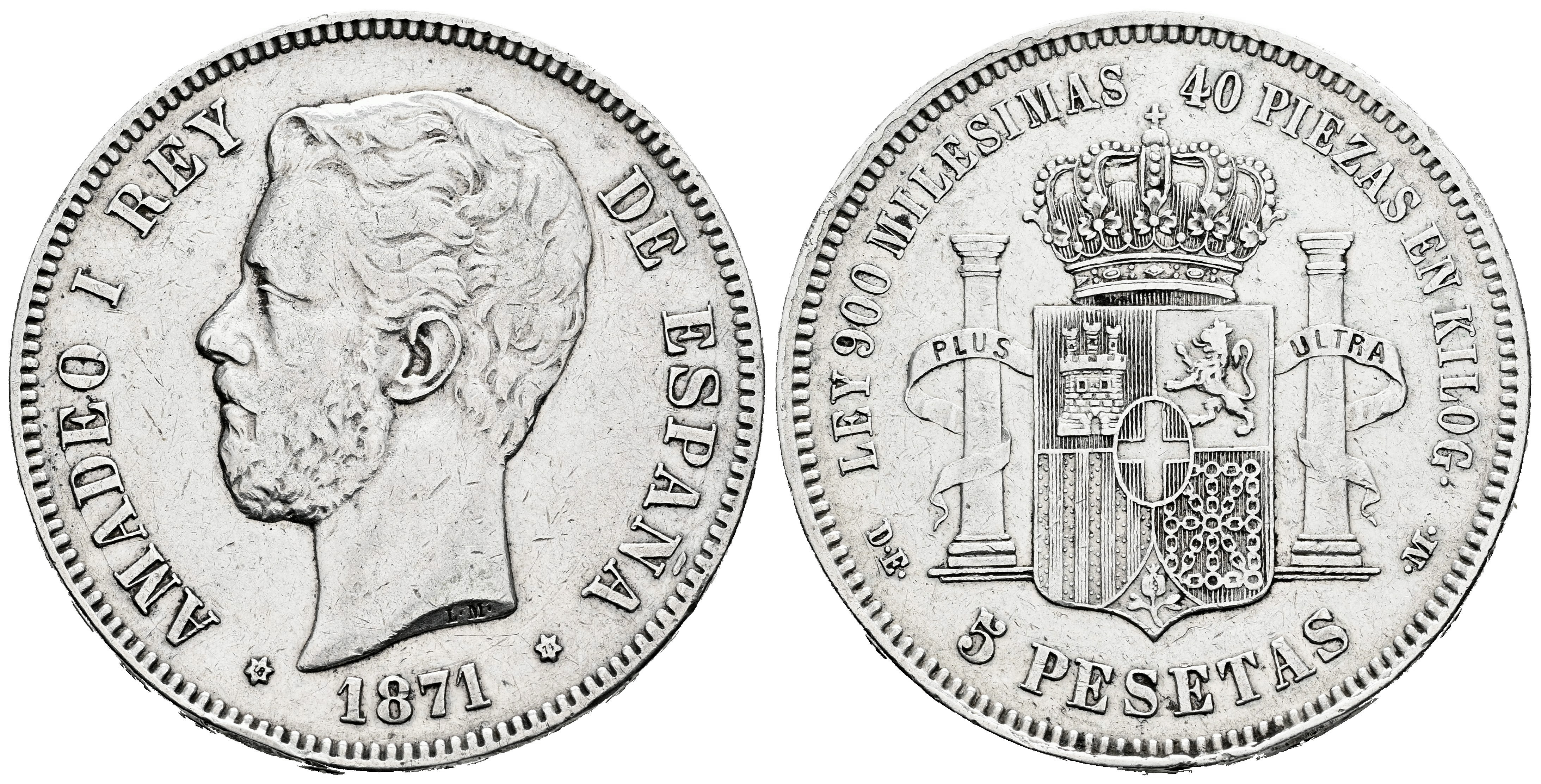 Centenario de la Peseta (1868-1931). Amadeo I (1871-1873). 5 pesetas. 1871*18-74. Madrid. DEM. (Cal-5). Ag. 24,76 g. Limpiada. MBC. Est...45,00.