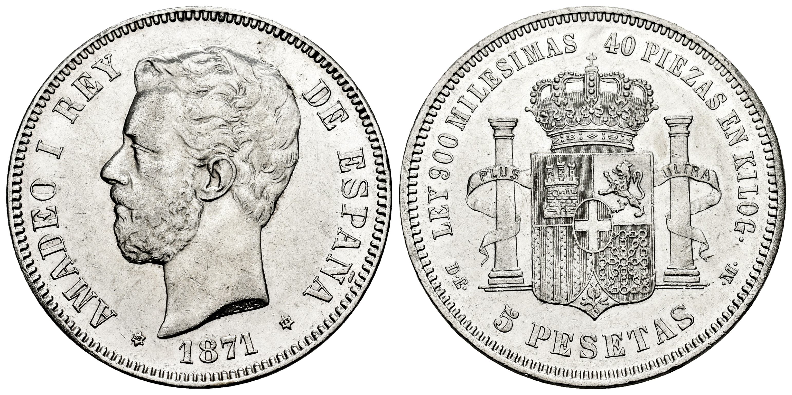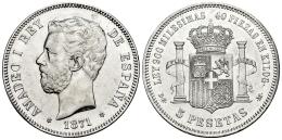 Centenario de la Peseta (1868-1931). Amadeo I (1871-1873). 5 pesetas. 1871*18-75. Madrid. DEM. (Cal-7). Ag. 24,91 g. Acuñada bajo Alfonso XII. Ligeramente limpiada. EBC-. Est...90,00.