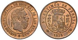 Centenario de la Peseta (1868-1931). Carlos VII (1872-1876). 5 céntimos. 1875. Oñate. (Cal-2). Ae. 5,13 g. Bonito color y brillo original. EBC+. Est...120,00.