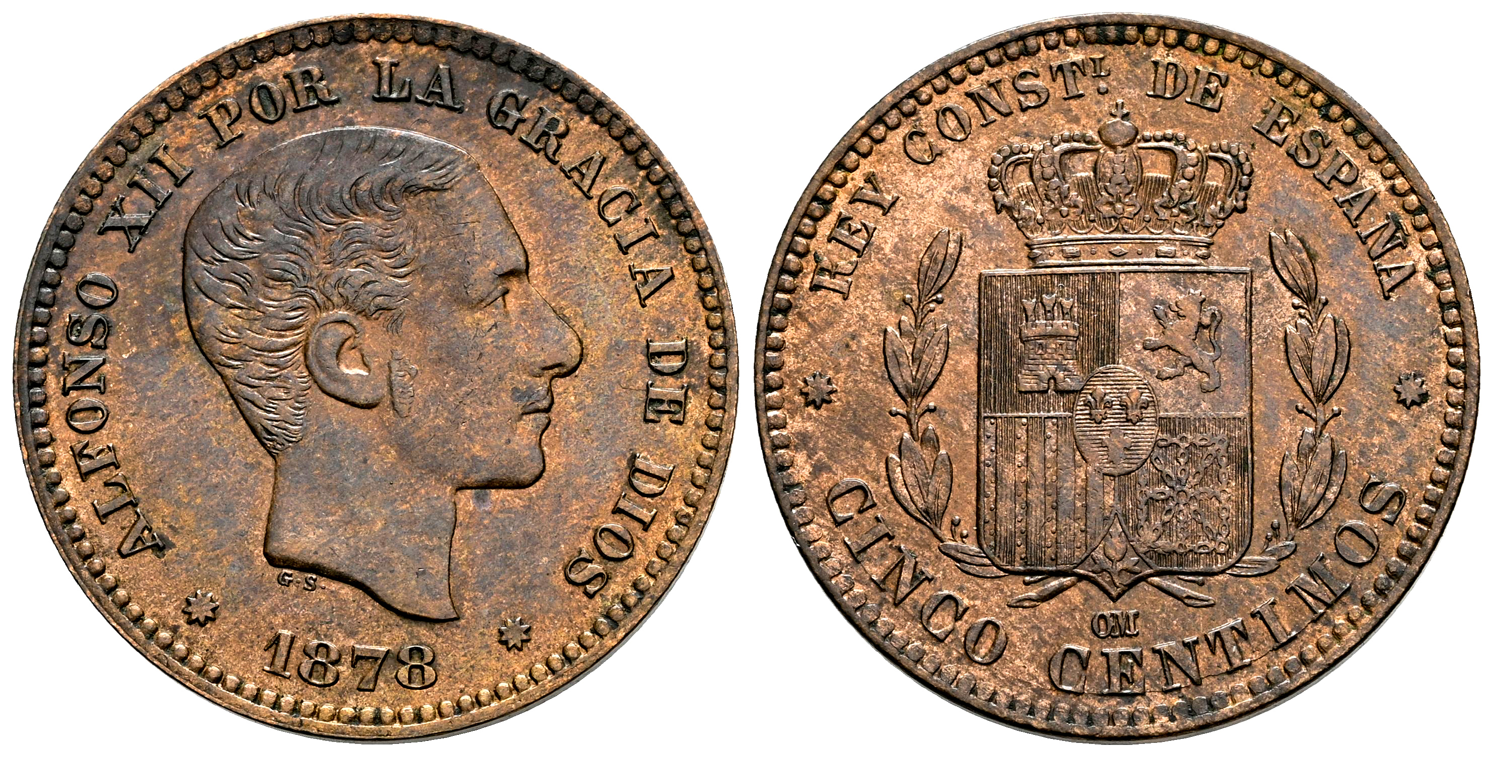 Centenario de la Peseta (1868-1931). Alfonso XII (1874-1885). 5 céntimos. 1878. Barcelona. OM. (Cal-5). Ae. 5,00 g. EBC/MBC+. Est...60,00.