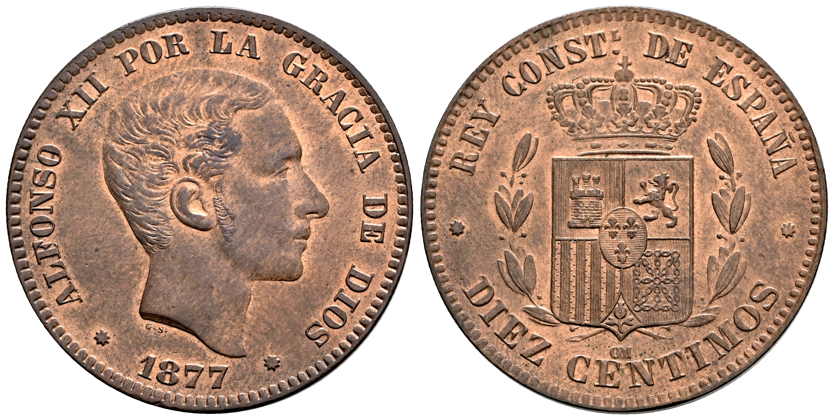 Centenario de la Peseta (1868-1931). Alfonso XII (1874-1885). 10 céntimos. 1877. Barcelona. OM. (Cal-8). Ae. 9,87 g. Restos de brillo original. EBC. Est...100,00.