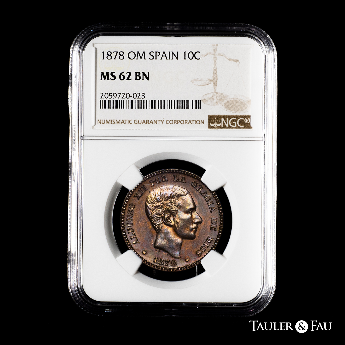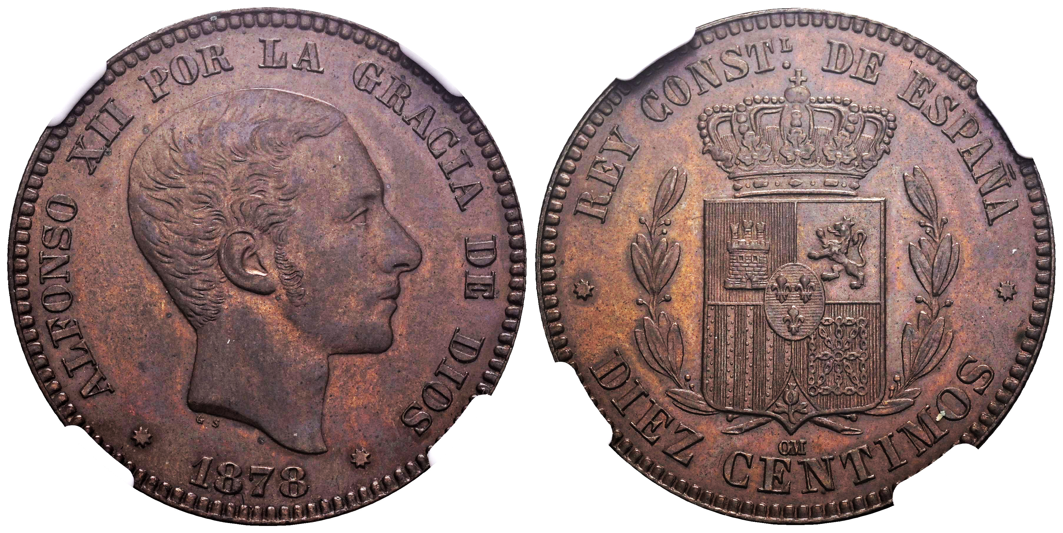 Centenario de la Peseta (1868-1931). Alfonso XII (1874-1885). 10 céntimos. 1878. Barcelona. OM. (Cal-9). Au. Escasa en esta conservación. Encapsulada por NGC como MS 62 BN. Est...200,00.
