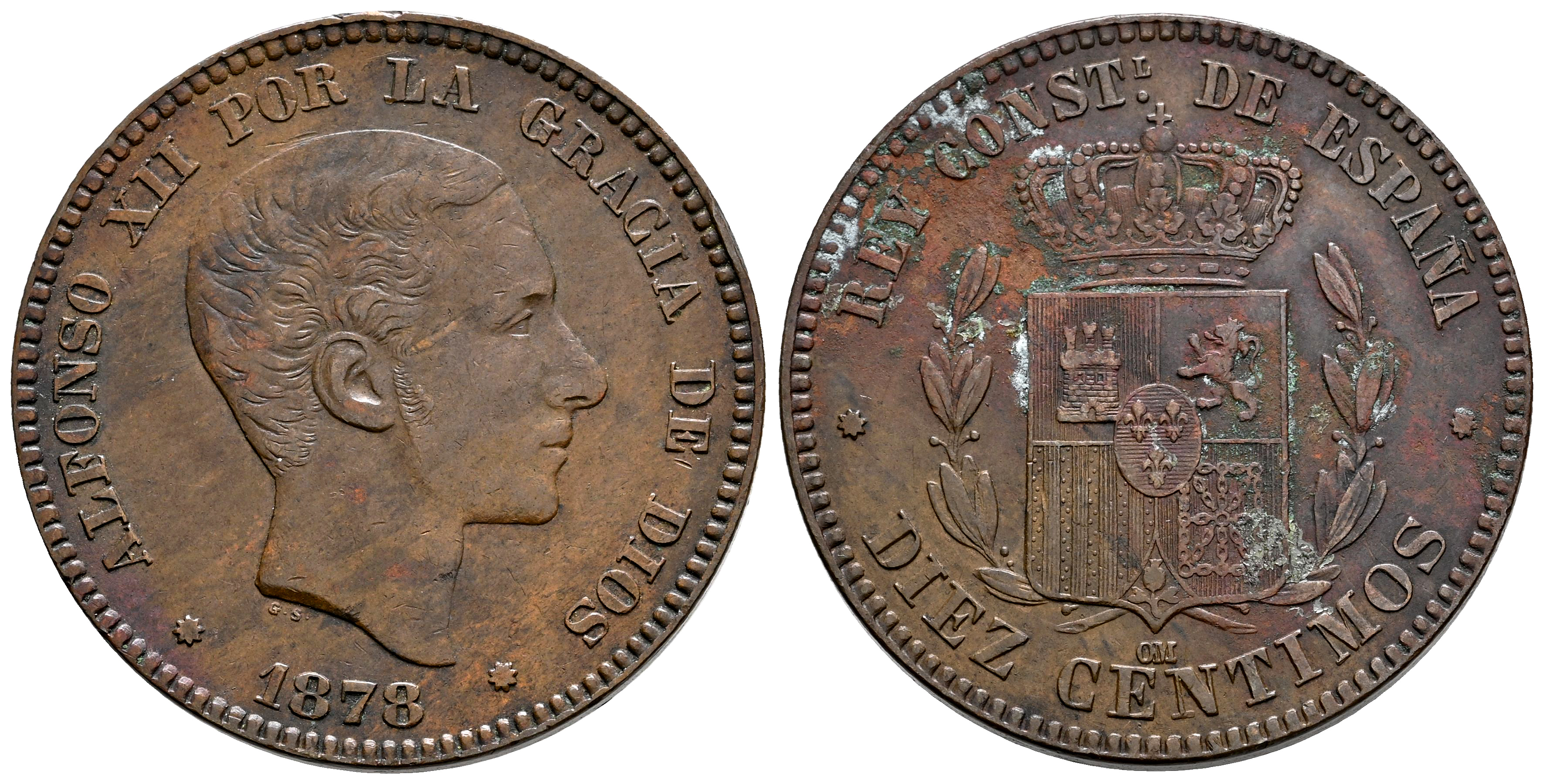Centenario de la Peseta (1868-1931). Alfonso XII (1874-1885). 10 céntimos. 1878. Barcelona. OM. (Cal-9). Ae. 9,94 g. MBC. Est...60,00.