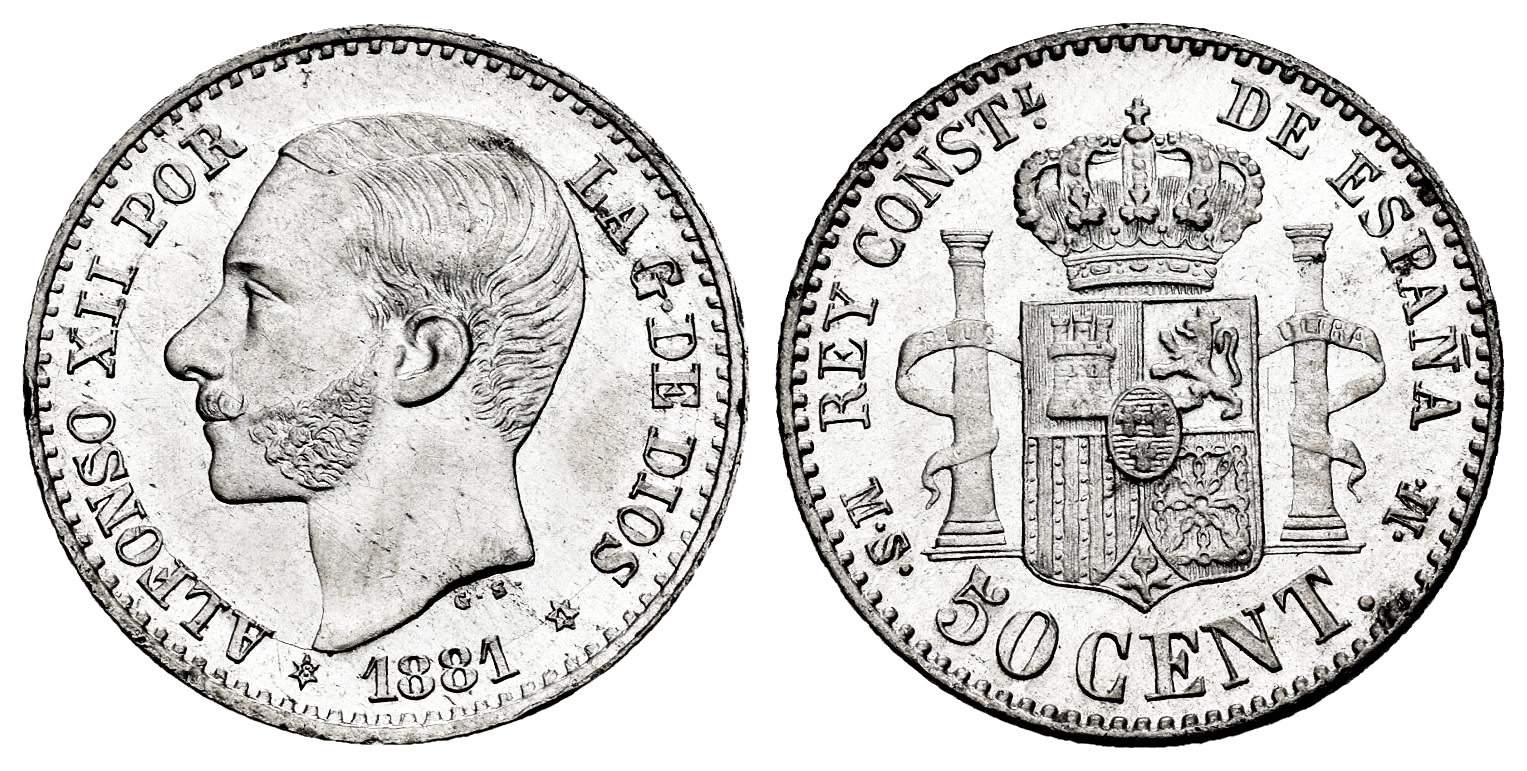 Centenario de la Peseta (1868-1931). Alfonso XII (1874-1885). 50 céntimos. 1881*8-1. Madrid. MSM. (Cal-12). Ag. 2,51 g. Pleno brillo original. Golpecito en el canto. SC-. Est...180,00.