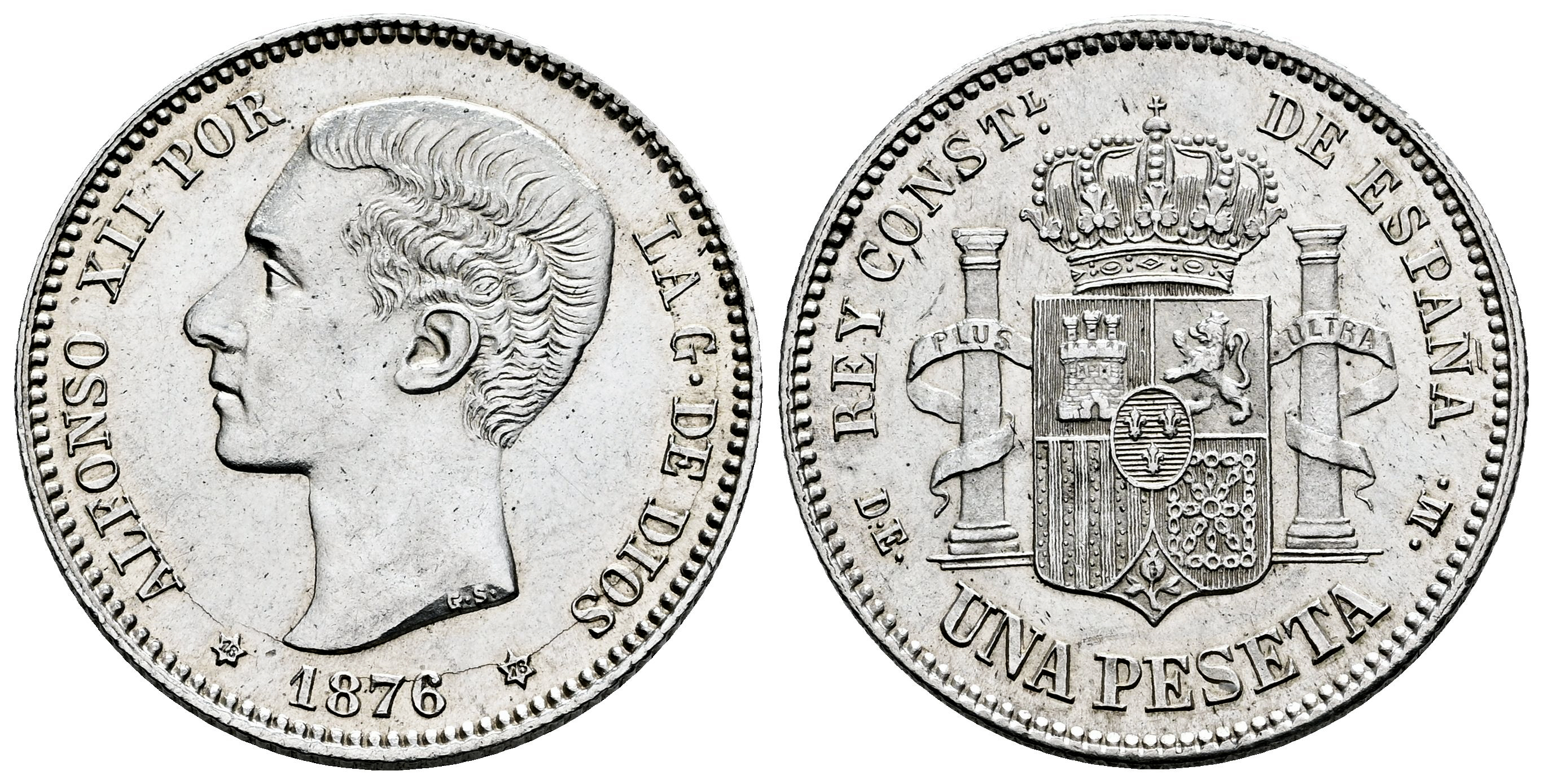 Centenario de la Peseta (1868-1931). Alfonso XII (1874-1885). 1 peseta. 1876*18-76. Madrid. DEM. (Cal-15). Ag. 5,01 g. Brillo original. Atractiva. Rara en esta conservación. SC-. Est...900,00.