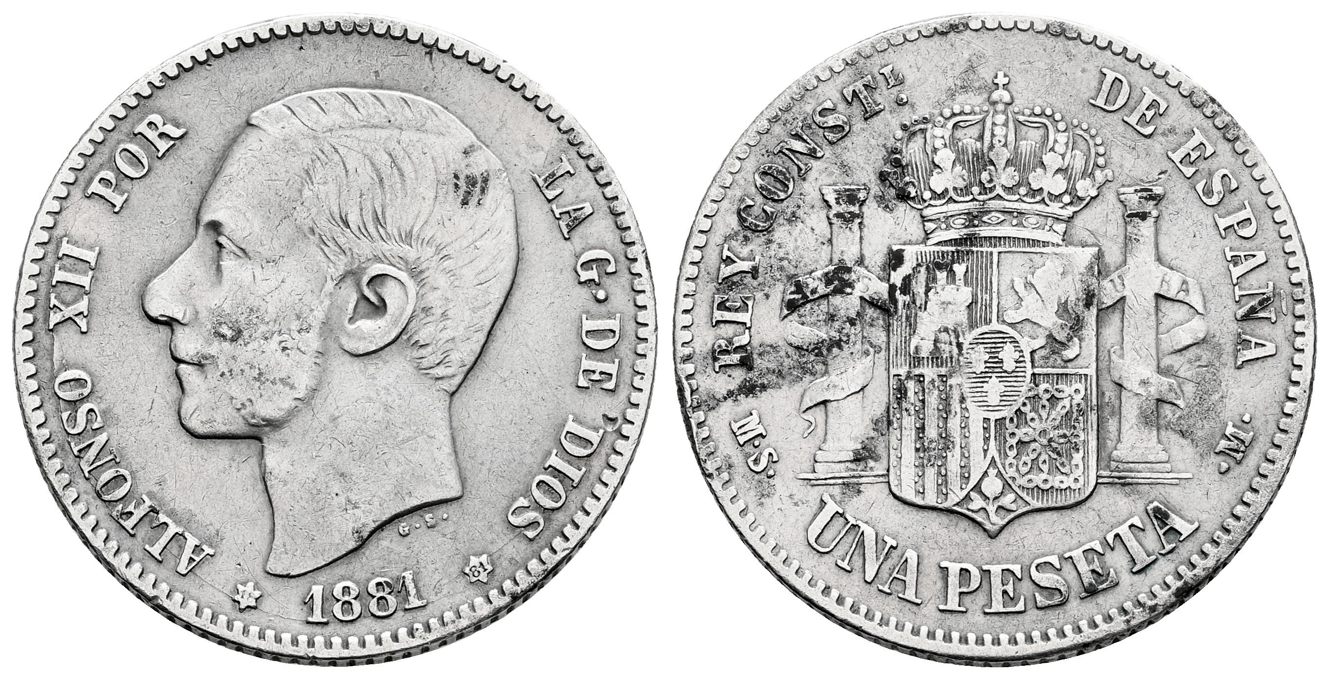 Centenario de la Peseta (1868-1931). Alfonso XII (1874-1885). 1 peseta. 1881*18-81. Madrid. MSM. (Cal-17). Ag. 4,94 g. Ligeras oxidaciones limpiadas. MBC-/BC+. Est...45,00.