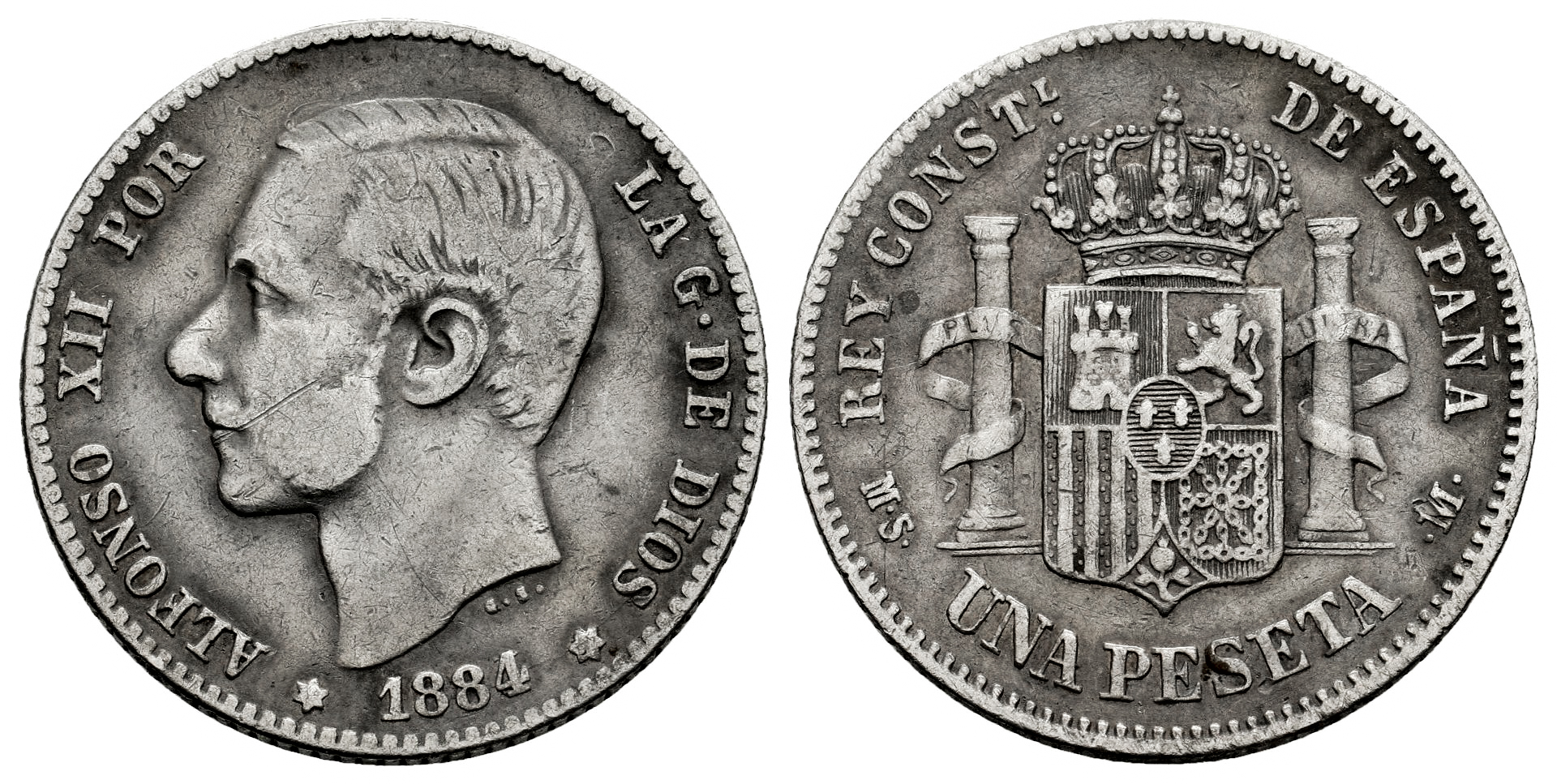 Centenario de la Peseta (1868-1931). Alfonso XII (1874-1885). 1 peseta. 1884*_ _-84. Madrid. MSM. (Cal-23). Ag. 4,81 g. Estrella tenue. Rara. BC+/MBC-. Est...300,00.
