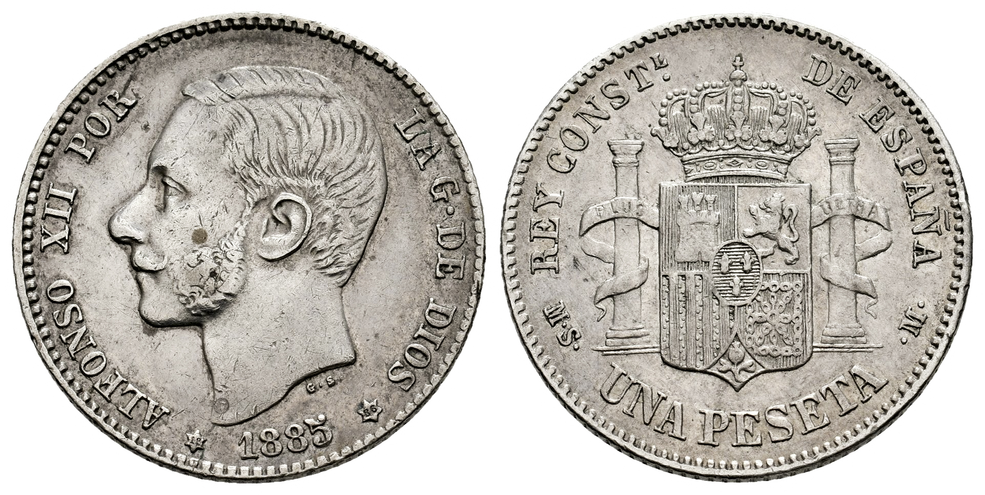 Centenario de la Peseta (1868-1931). Alfonso XII (1874-1885). 1 peseta. 1885*18-86. Madrid. MSM. (Cal-25). Ag. 5,01 g. MBC. Est...120,00.