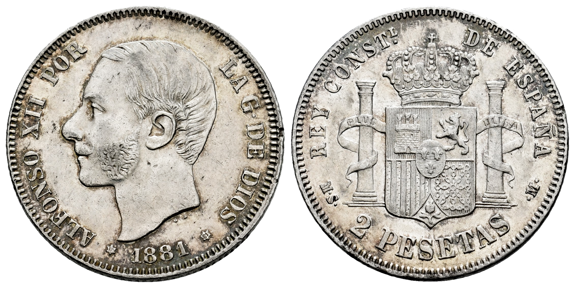 Centenario de la Peseta (1868-1931). Alfonso XII (1874-1885). 2 pesetas. 1881*18-81. Madrid. MSM. (Cal-28). Ag. 10,00 g. Restos de brillo original. MBC+/EBC-. Est...120,00.