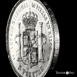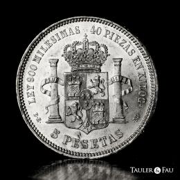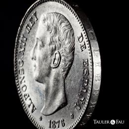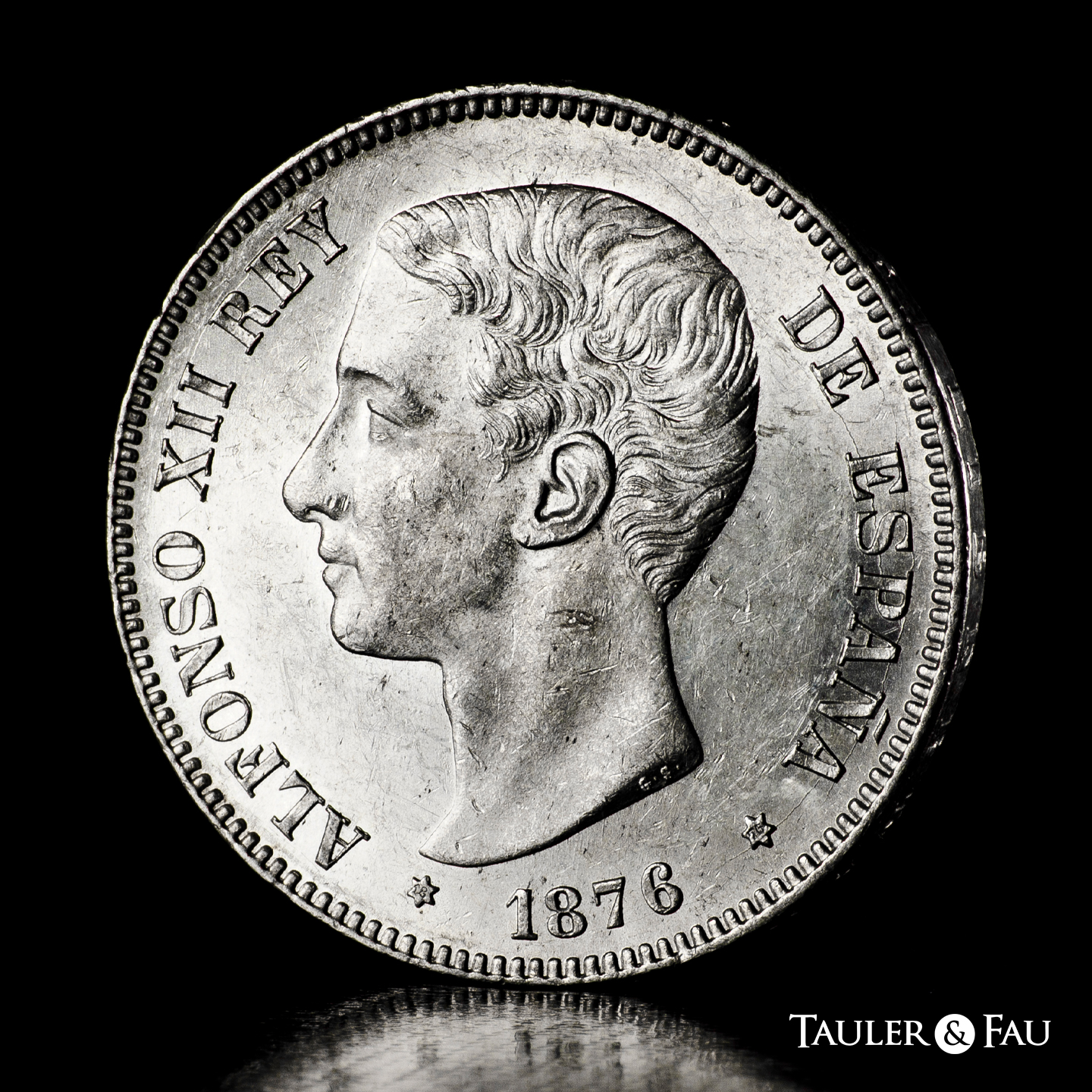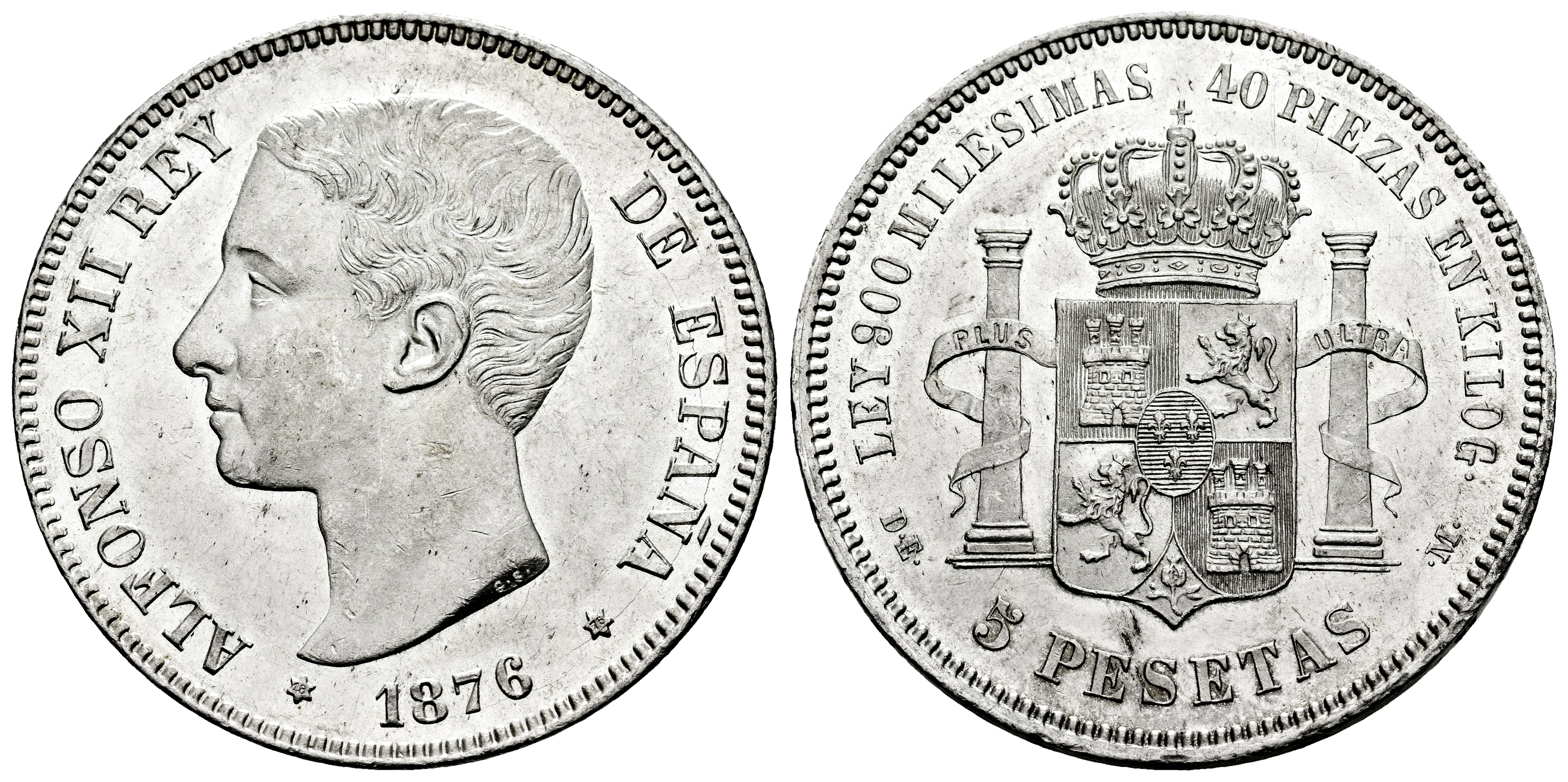 Centenario de la Peseta (1868-1931). Alfonso XII (1874-1885). 5 pesetas. 1876*18-76. Madrid. DEM. (Cal-37). Ag. 25,18 g. Rayitas. Pleno brillo original. EBC+. Est...750,00.