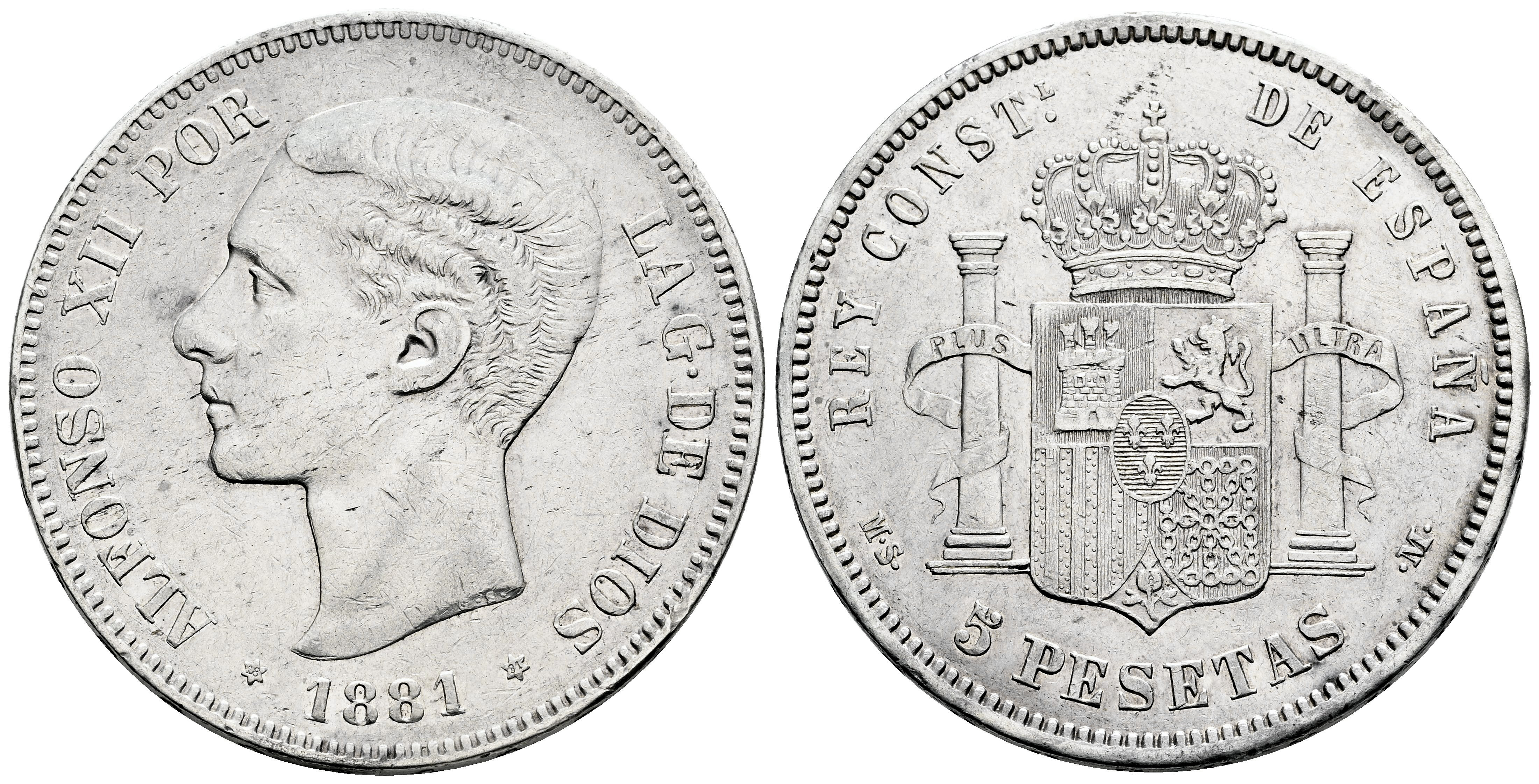 Centenario de la Peseta (1868-1931). Alfonso XII (1874-1885). 5 pesetas. 1881*18-81. Madrid. MSM. (Cal-44). Ag. 24,87 g. Golpecitos en el canto y suaves rayitas. MBC+. Est...75,00.