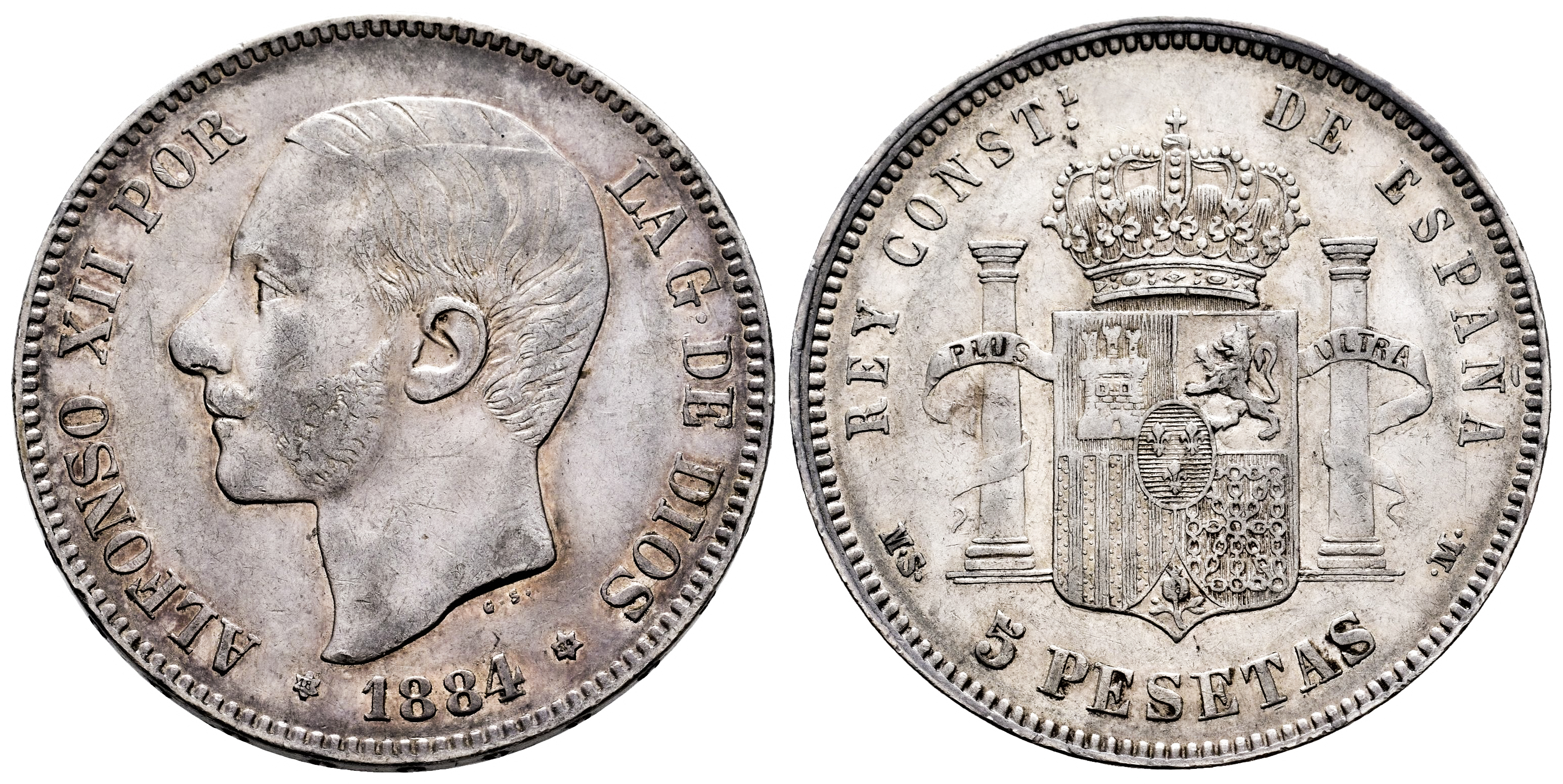 Centenario de la Peseta (1868-1931). Alfonso XII (1874-1885). 5 pesetas. 1884*18-84. Msdr. MSM. (Cal-57). Ag. 24,97 g. MBC+. Est...60,00.
