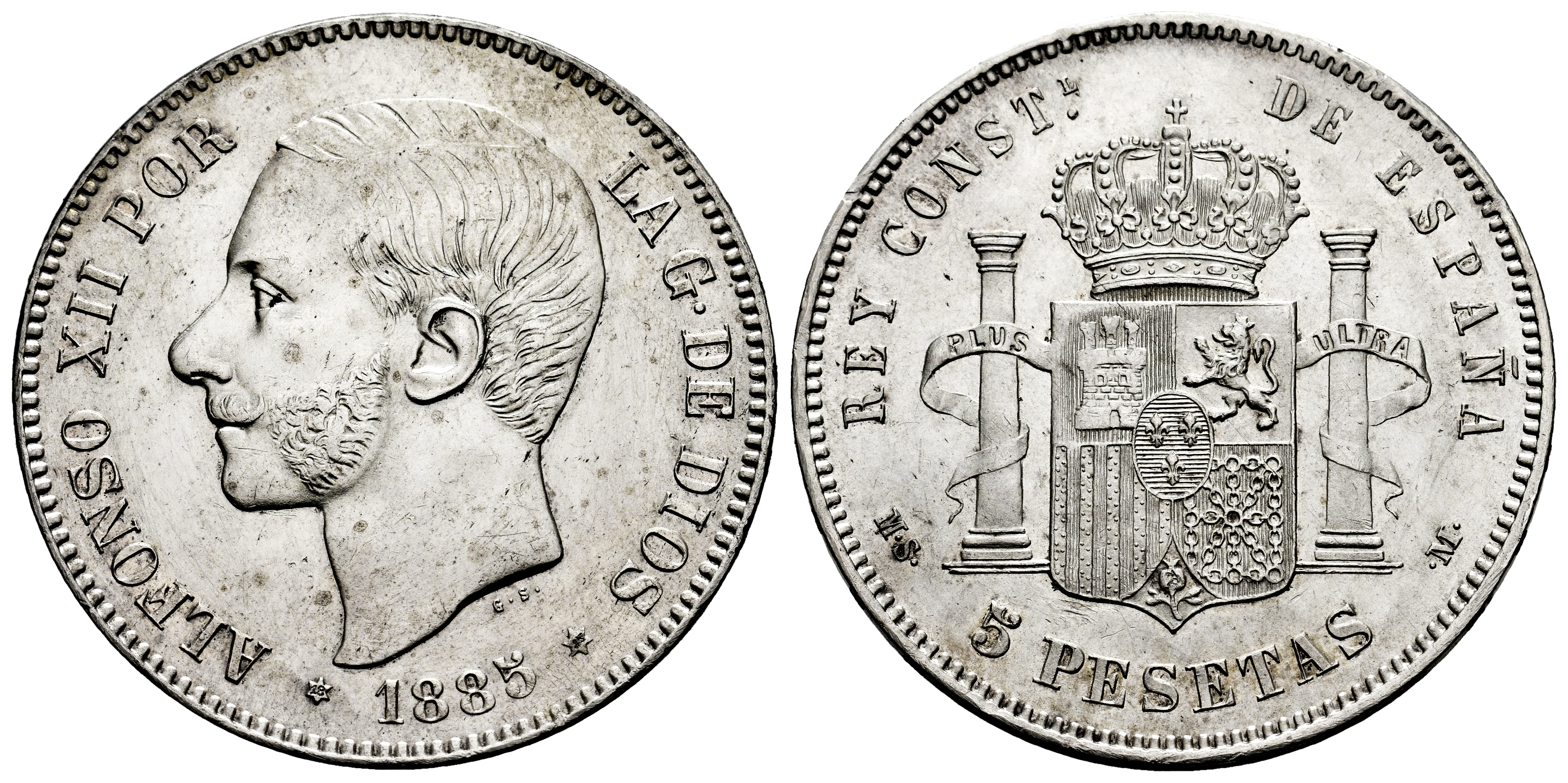 Centenario de la Peseta (1868-1931). Alfonso XII (1874-1885). 5 pesetas. 1885*18-85. Madrid. MSM. (Cal-60). Ag. 24,96 g. Anverso limpiado. Brillo orginal. EBC-/EBC. Est...300,00.